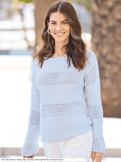 Dieser Mustermix-Pullover mit geradem Halsausschnitt wirkt ganz straight. Schmale Streifen aus glatt rechts und glatt links wechseln sich ab mit etwas breiteren in einem strukturierten Rippenmuster und einem Lochmuster. Das kräftige Garn aus Baumwolle mit Polyamid prädestiniert das Modell sowohl für kühlere Abende im Sommer als auch später in der Übergangszeit als Ganztagsmodell. Während Vorder- und Rückenteil einfach zwei Rechtecke sind, beginnen die Ärmel ganz gerade und gewinnen an Weite erst im oberen Teil. Der Bund wird im Rippenmuster gearbeitet. Eine Anleitung kann für die Größen 36/38, 40/42 und 44/46 downgeloadet werden.