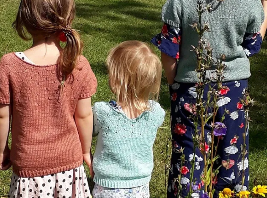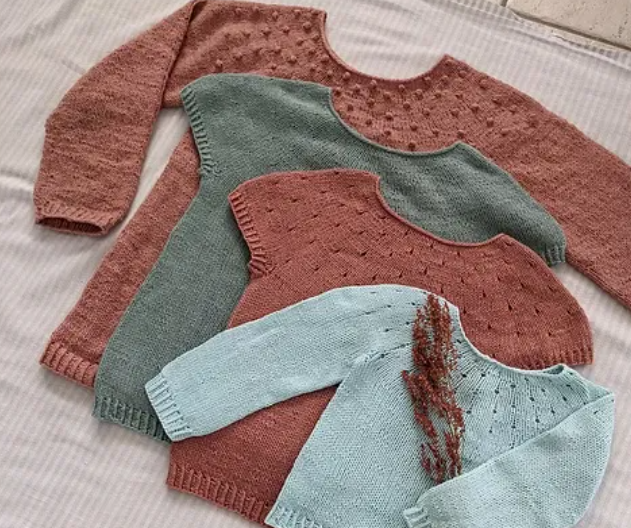 Er wird von oben nach unten mit gleichmäßig verteilten Zunahmen über die Rundpasse gestrickt. So erhält man eine schlichte glatt rechts Version, ein sommerliches einfaches Lochmuster oder verspielte Noppen-Passe. Auch bei den Ärmeln könnt ihr euch entscheiden: Kurzarm oder Langarm (gerade oder schmal zulaufend). Durch dieses Baukastensystem können wirklich unzählige verschiedene Pullover/Oberteile entstehen.