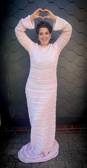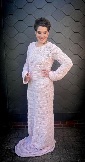 Das Kleid Baltic Queen wird in einem Stück von oben nach unten gehäkelt. Das bedeutet, du kannst jederzeit selbst bestimmen, wie lang dein Kleid werden soll.