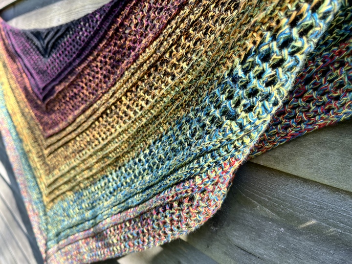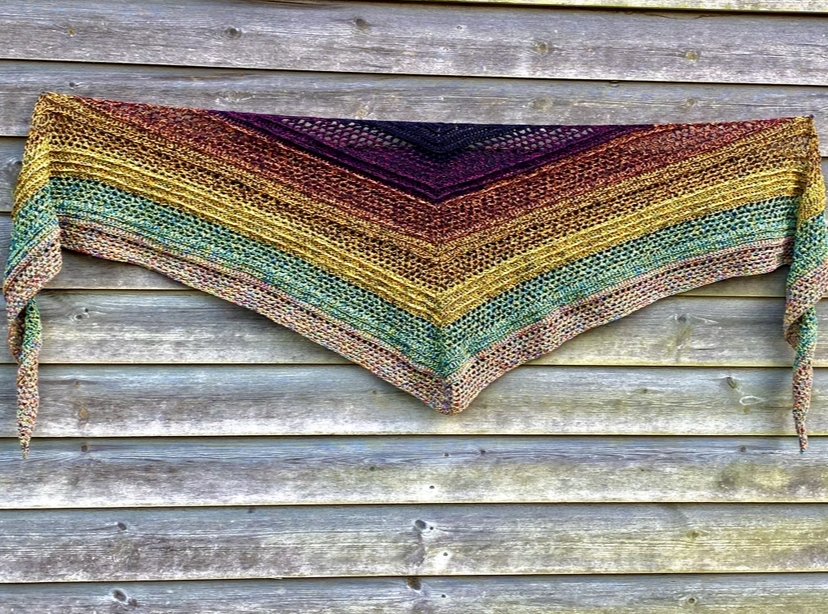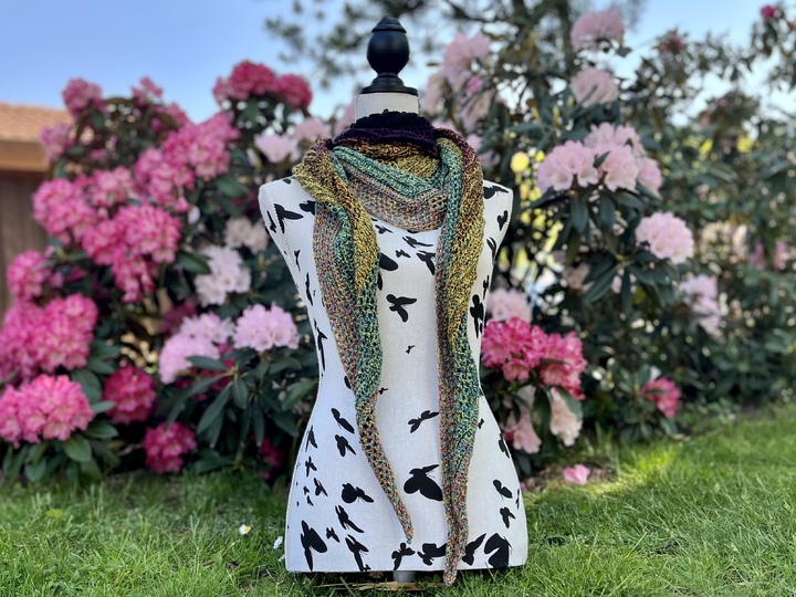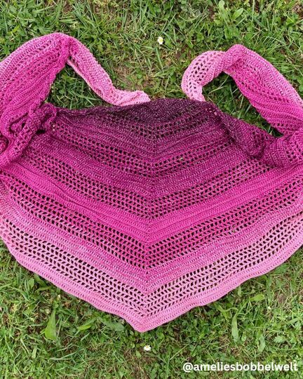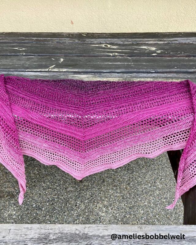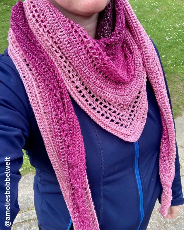 Da es sich um ein flaches Dreieckstuch handelt, benötigst du weniger Garn als für normale Dreieckstücher um eine ausreichende Breite zu erzielen.