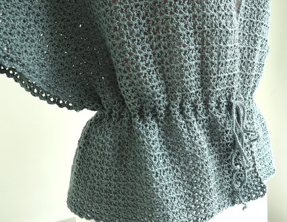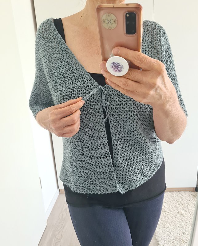 Der Cardigan "Emma" wird in einem Stück von oben nach unten gehäkelt (RVO), somit auch perfekt für Farbverläufe geeignet. Du kannst die kurze Jacke entweder figurbetont mit Bindegürtel oder eher lässig ohne Bindegürtel tragen. Auch kannst du am Ausschnitt zwei Bindebänder fixieren und diese zur Schleife binden. Egal welche Variante du wählst, die Jacke "Emma" passt zu vielen Gelegenheiten.