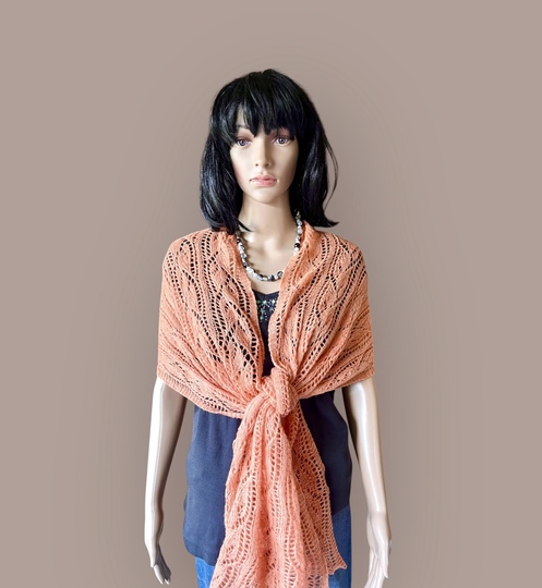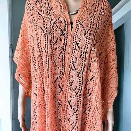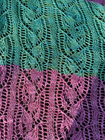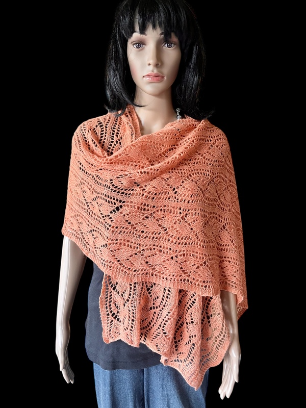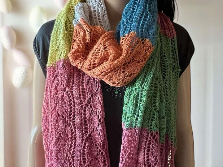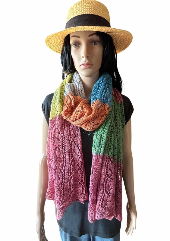 Der Sommerschal Gesa ist ein leichter Laceschal aus 200g Lace (800m LL/100g) und ist hier in der Buntversion mit 5x20g und 1x 100g Lace gestrickt.