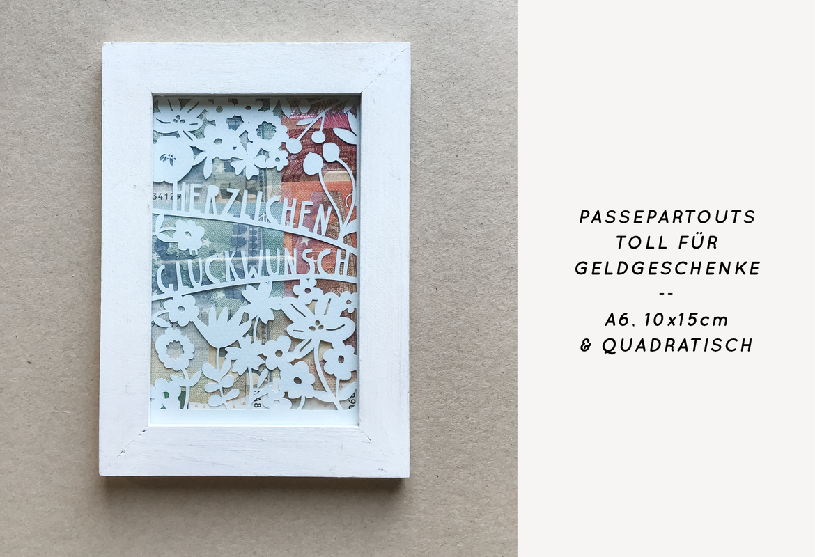 Gerade wenn man eine hübsche Verpackung für Geldgeschenke braucht, fällt die Auswahl oft schwer. Mit meinen flexiblen Vorlagen für den Schneidplotter ist man aber immer gut gerüstet: Als Passepartout für A6, 10x15 oder quadratische Rahmen kann man einfach und schnell Geldscheine "hinter Glas" bringen und superhübsch verpacken. Das neutrale "Herzlichen Glückwunsch" passt zu ganz vielen Gelegenheiten: Geburtstag, Kommunion, Konfirmation, Hochzeit, Jubiläum, Schulabschluss, Führerschein, Ruhestand oder Hochzeitstage.