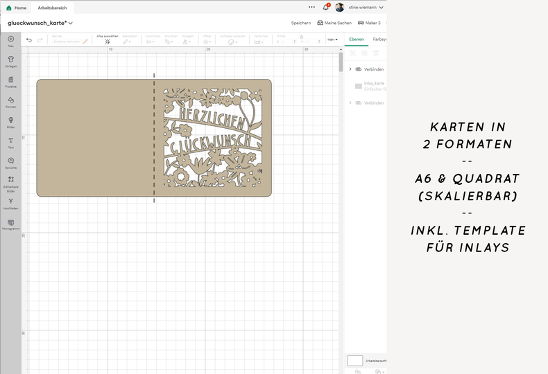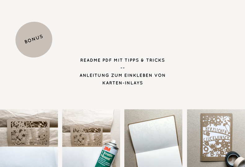 In der Lieferung enthalten ist neben der svg Datei jeweils auch noch die Vorlage als png, eps, dxf und pdf. Dazu gibt es eine kleine Anleitung ("read me" Datei), in der ich noch ein paar Tipps, Tricks und eine kleine Anleitung zum Einkleben von Karten-Inlays aufgeschrieben habe.
