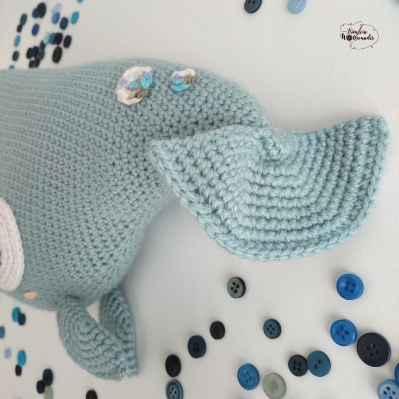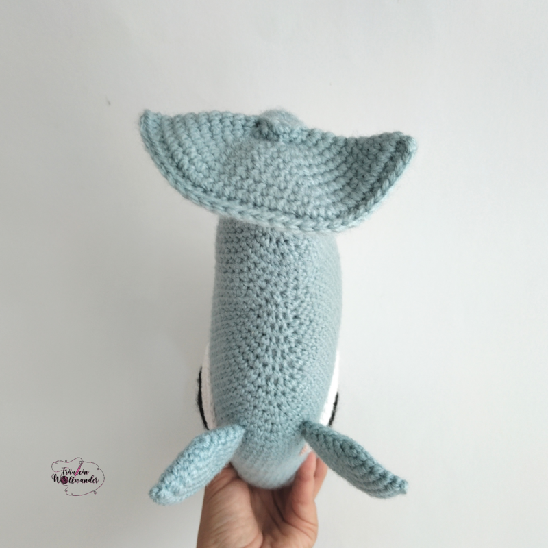 Wenn du Paul mit der angegebenen Wolle häkelst, wird er am Ende ca 31 cm lang und 17 cm breit (ohne Flossen)