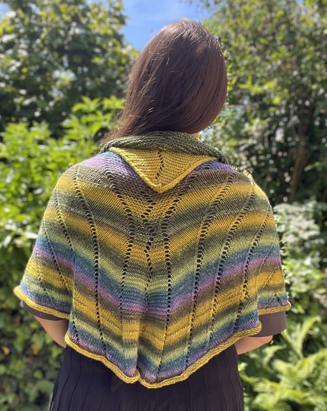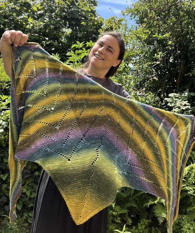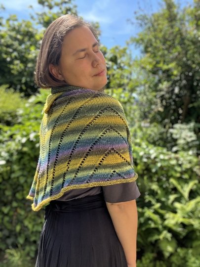 Das Selbstliebetuch ist ein besonderes, großes Tuch, welches einen weiten, gebogenen breiten Rand hat. Es wird an der einen Spitze begonnen und im Laufe der Arbeit werden immer mehr Maschen zugenommen. Umrahmt wird das Tuch von einem I-Cord, der direkt mitgestrickt wird. Am Ende wird das Tuch auch mit dem I-Cord abgekettet. Man nimmt nicht nur an den Rändern, sondern auch in der Mitte der Arbeit bis zum Schluss Maschen zu. Dadurch bekommt es sozusagen eine zweite „Spitze“. Am Ende kann man das Tuch „klassisch“ als Dreieckstuch tragen oder als Schulterwärmer über die Schultern legen. Durch die mittleren Zunahmen entsteht eine Art Kragen, den man so drapieren kann wie man es möchte.