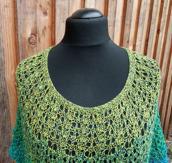 Das Lochmuster ist viel einfacher zu stricken als es aussieht, man muss nur in jeder vierten Reihe „Löcher“ stricken. Es gibt keine Nähte. Die anderen drei Reihen werden dann einfach glatt rechts gestrickt. Dadurch ist die Tunika schnell gestrickt und erfordert nicht ständig die volle Aufmerksamkeit bis zur Fertigstellung.