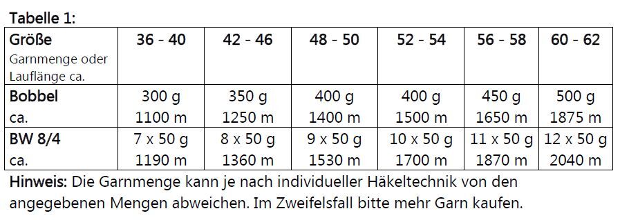 Bobbel 4-fädig, 375 m/100 g: 300 (350, 400, 400, 450, 500) g, 50 % Baumwolle / 50 % Polyacryl,