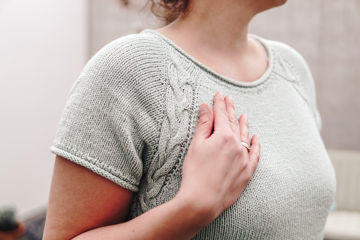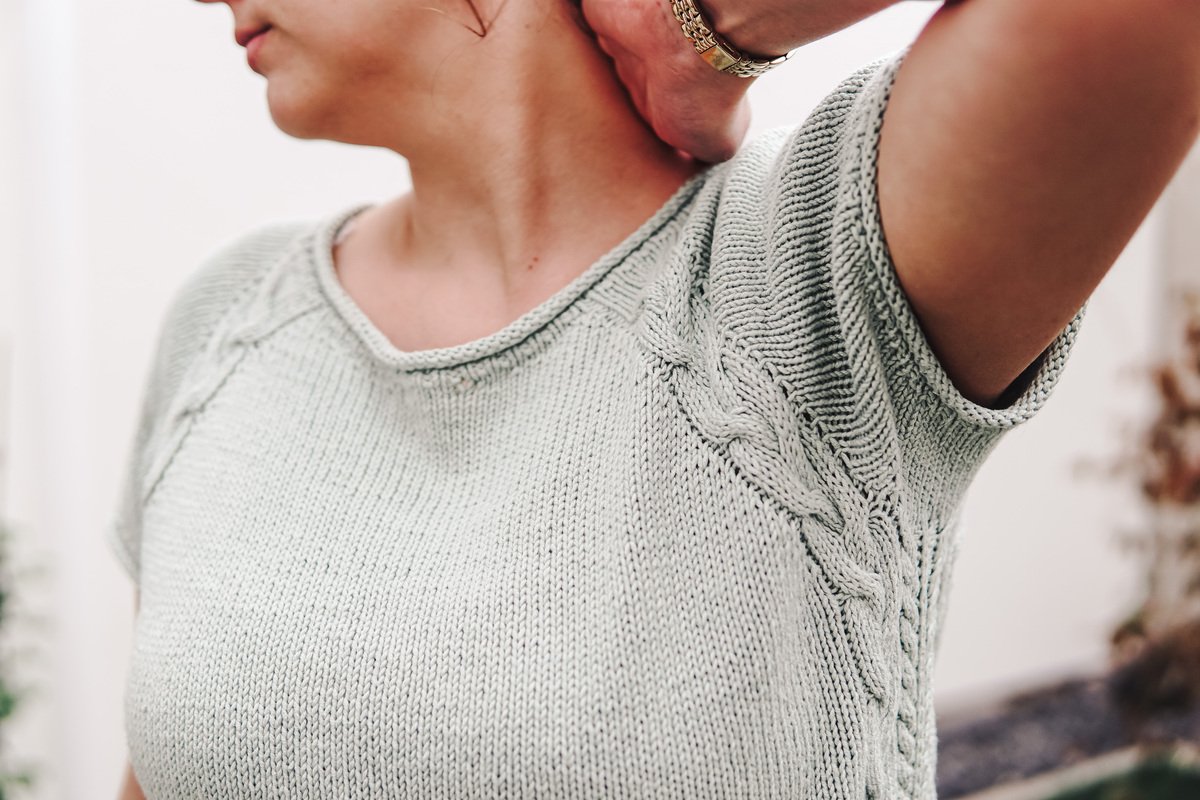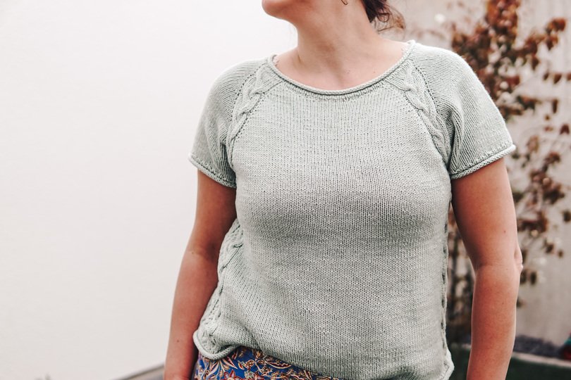 Ricardas Summertee ist ein T-Shirt aus einer weichen, angenehm zu tragenden Garnmischung aus Baumwolle, Alpaka und Seide. Die Raglanlinie wird von Zöpfen gebildet, die in eine verspielte Seitenlinie übergehen