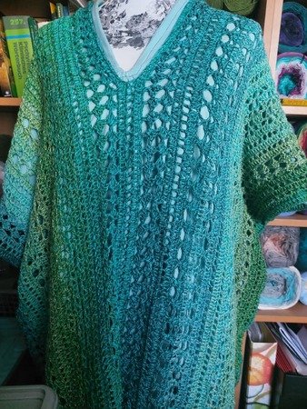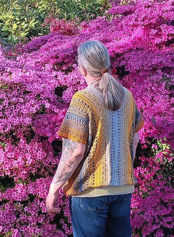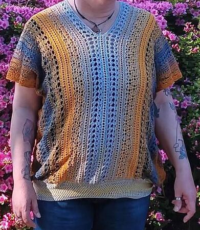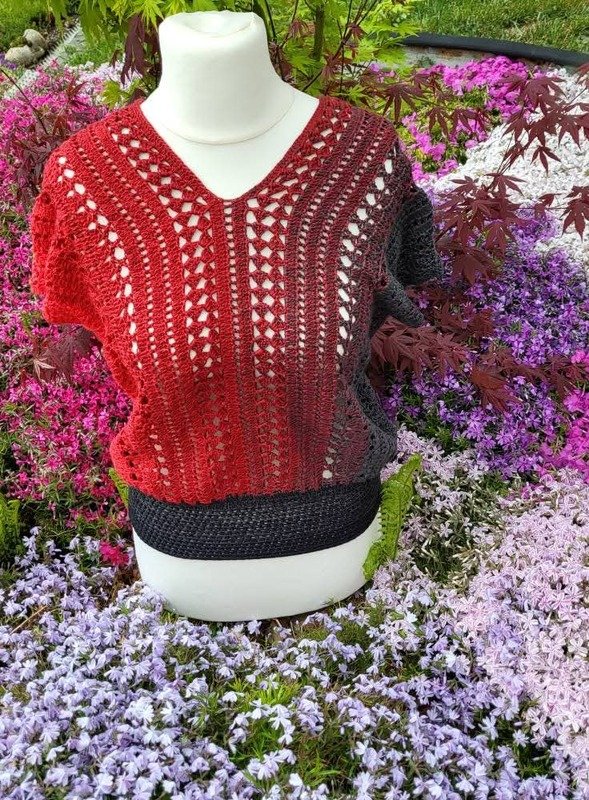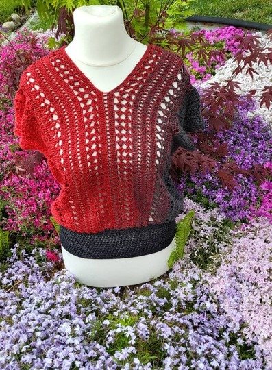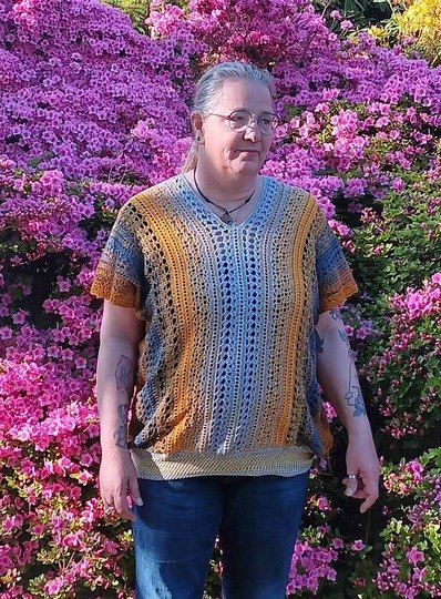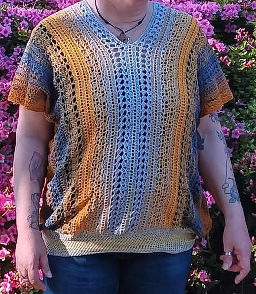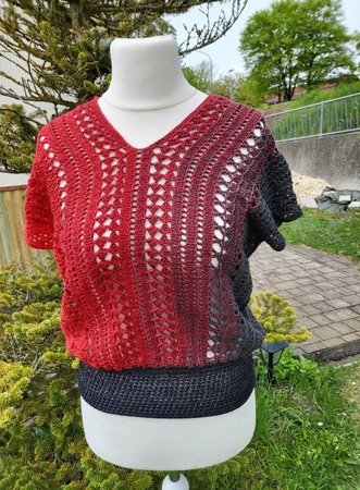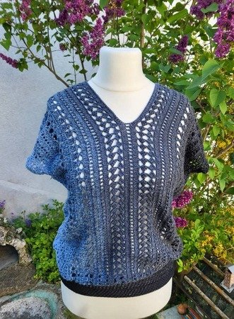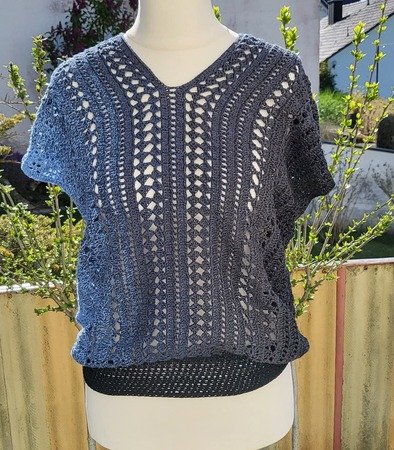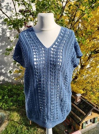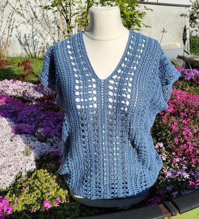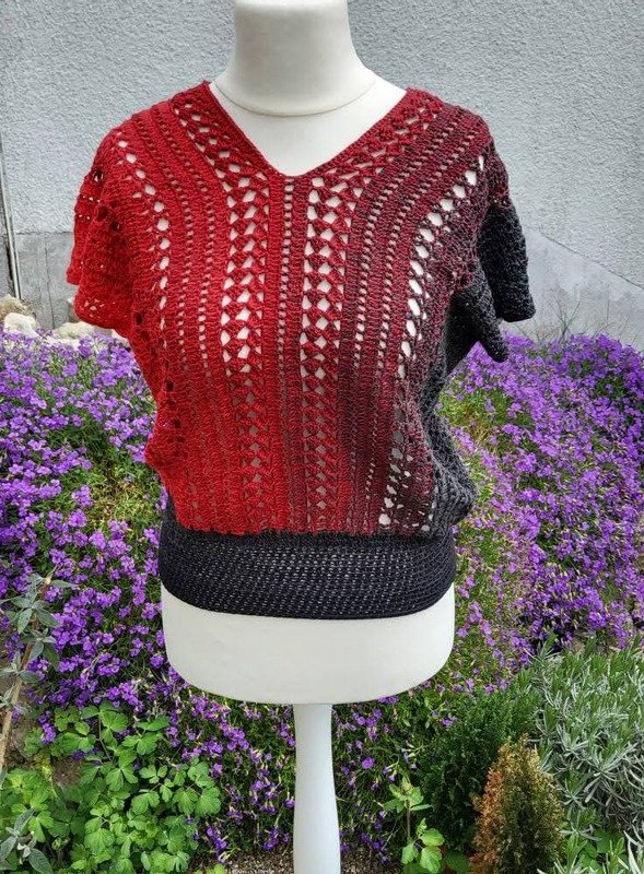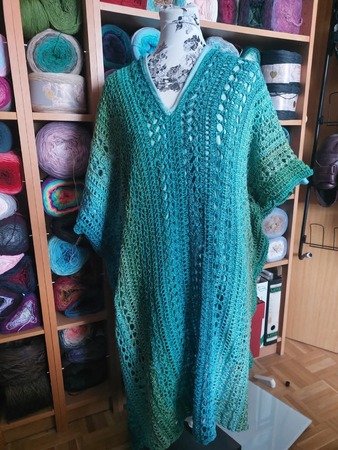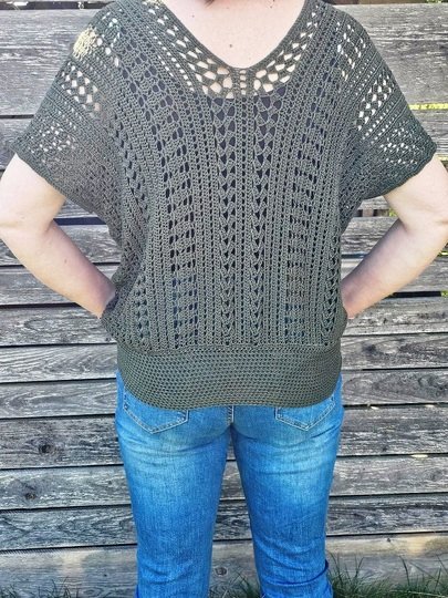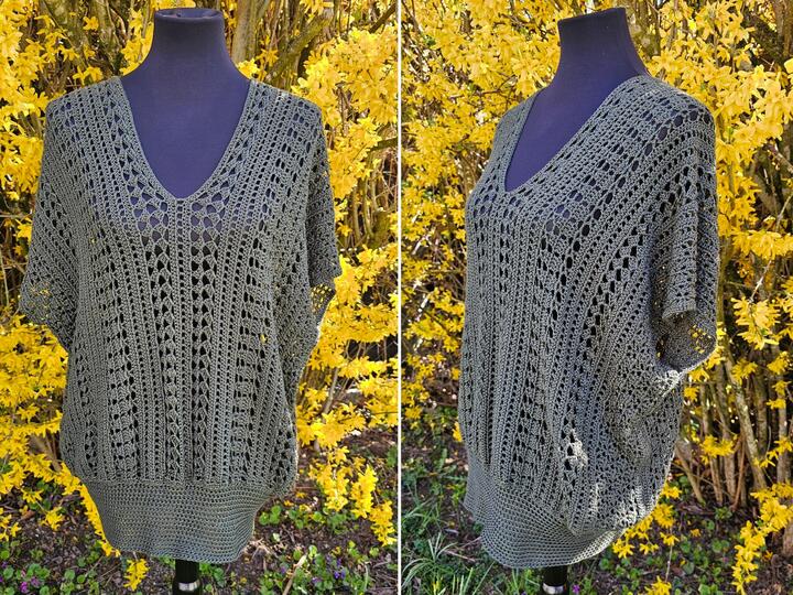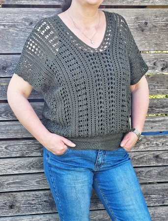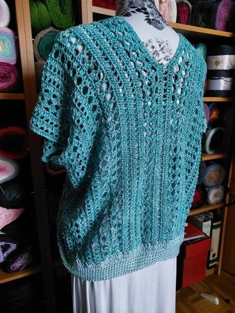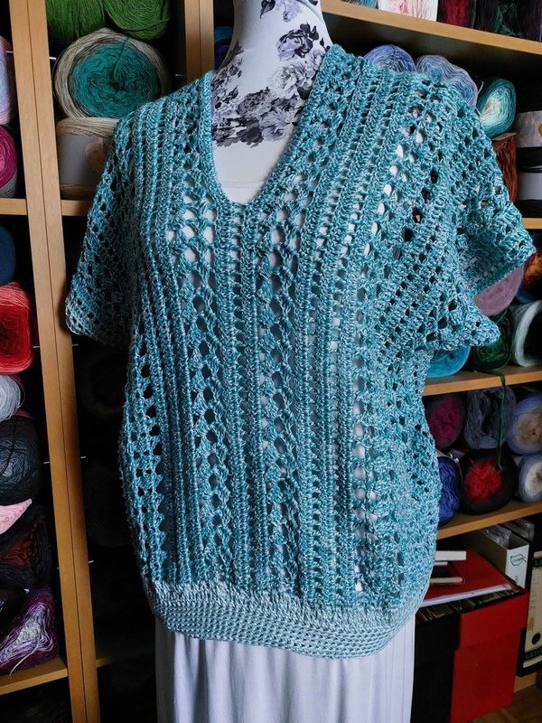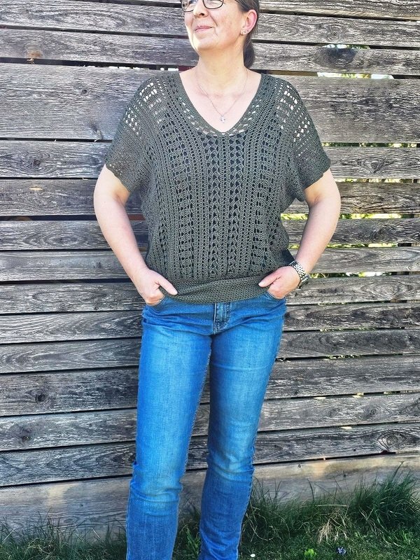 Es kann mit jedem gewünschten Garn gehäkelt werden. Mein Shirt ist aus einem Viskosebobbel in Uni Khaki von Kandelas Handarbeitsbox gehäkelt. Die benötigte Lauflänge richtet sich nach der gewünschten Größe, Länge und Form, einen ersten Anhaltspunkt bieten die Verbrauchsbeispiele.