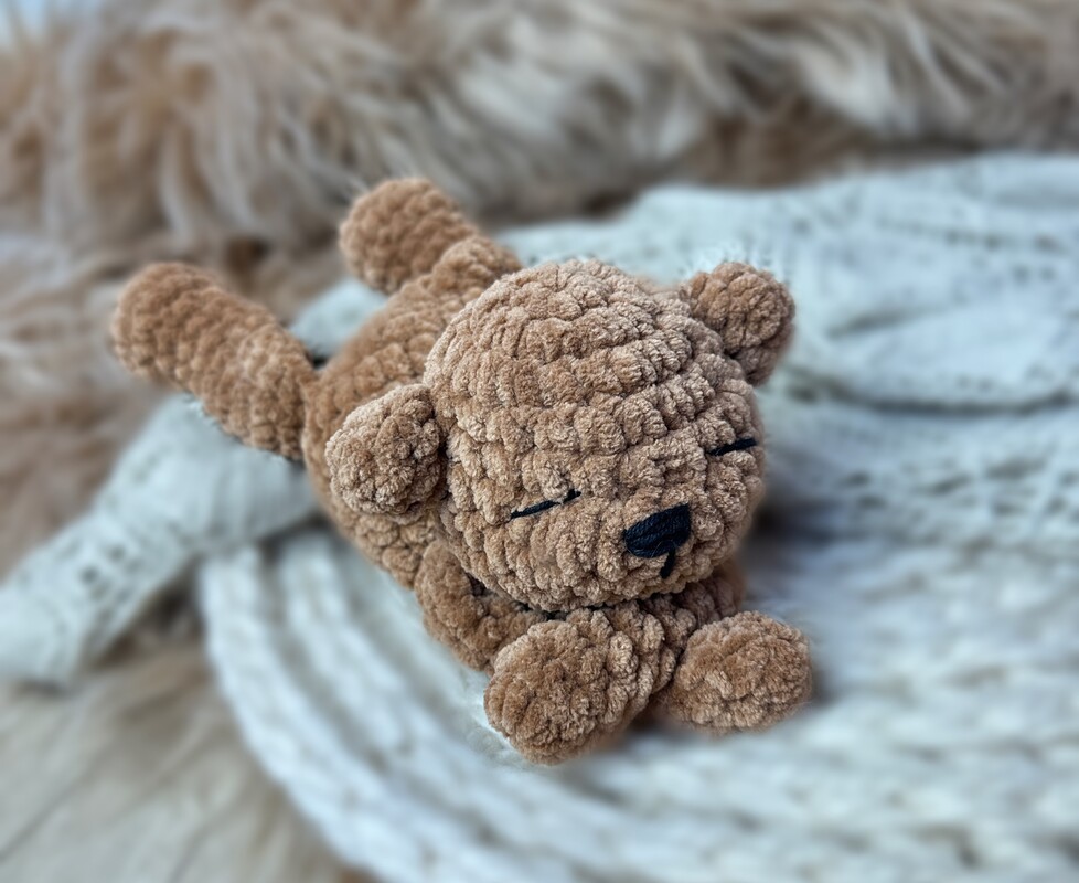 Diese Anleitung ist ein tolles DIY-Projekt für alle, die gerne mit Chenille häkeln und nach einem schnellen, unkomplizierten Kuschelbär suchen. Pelle ist ein weicher und zum Knautschen geeigneter Begleiter, der nicht nur kleinen Kindern viel Freude bereiten wird.
