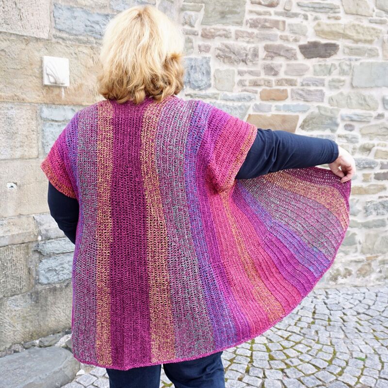 Die Lysvirka Anleitung ist individualisierbar, zum Beispiel für andere Garnstärken oder wenn man das Kleidungsstück länger oder kürzer häkeln möchte. Dies wird in einem Workshop am Ende der Anleitung genau erklärt.