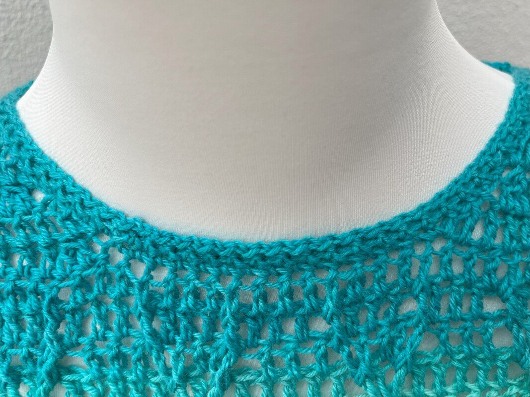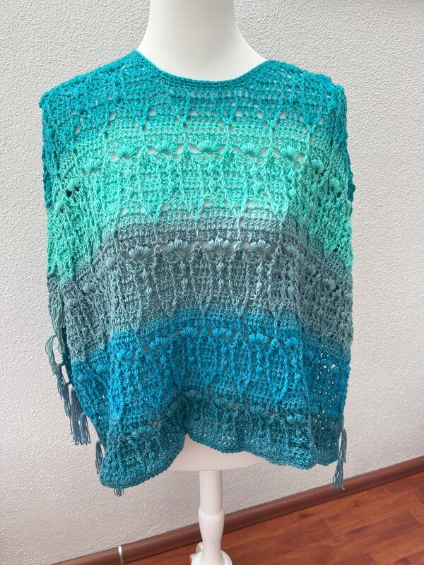 Poncho im schönen Farbverlaufsgarn für den Frühling und laue Sommerabende, der leicht und auch kuschelig ist. Die Größe ist leicht anpassbar, das Muster nicht schwer.