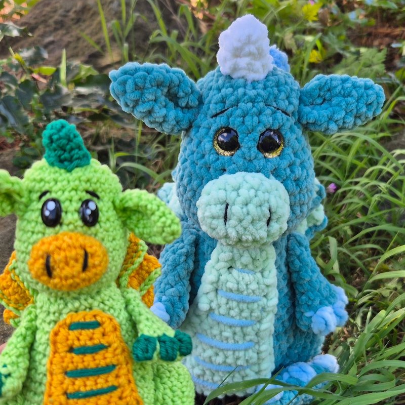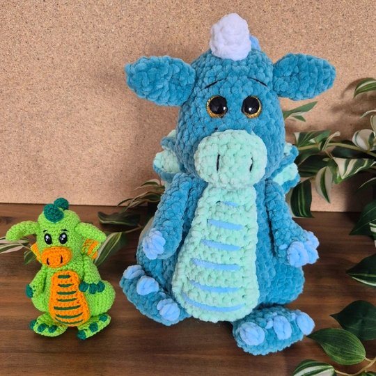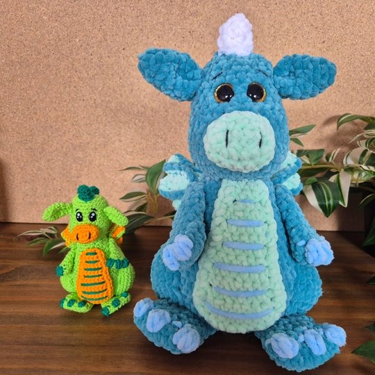 Der Drache lässt sich mit Chenillewolle, sowie mit Baumwolle häkeln.