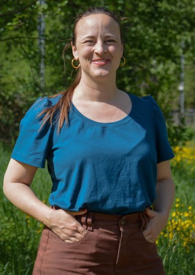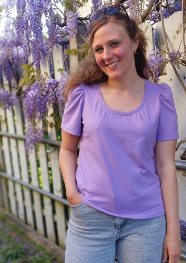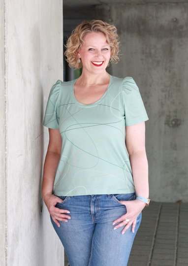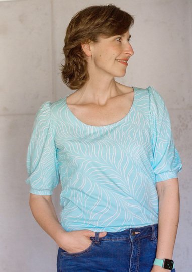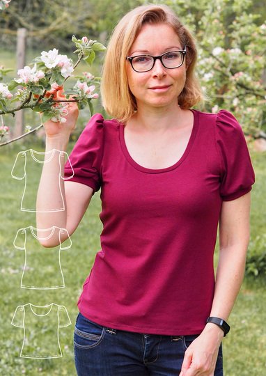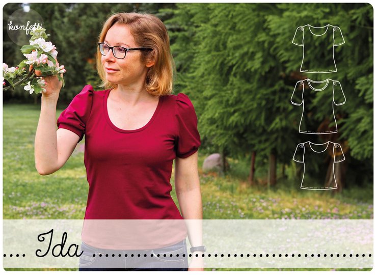 Ida ist ein Schnittmuster für ein lässiges Damen-Shirt mit niedlichen Puffärmeln für dehnbare Stoffe wie Jersey.
