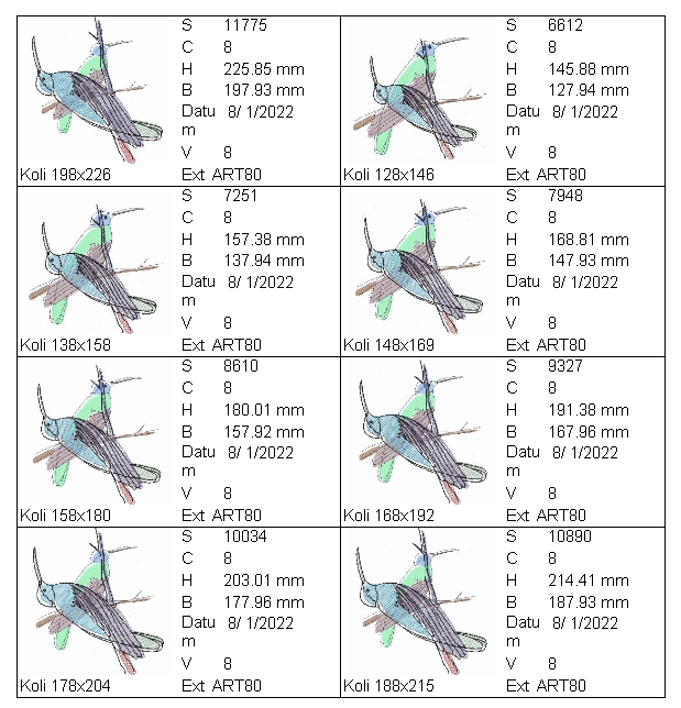 STICHE UND GRÖßENÜBERSICHT: