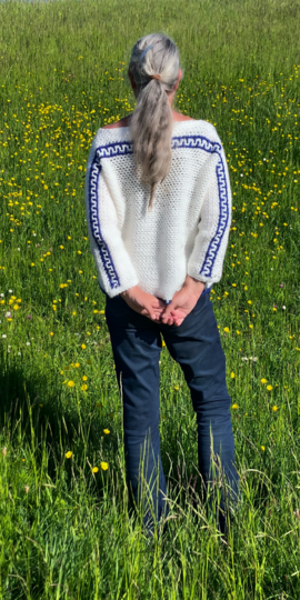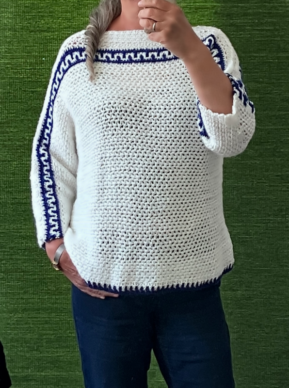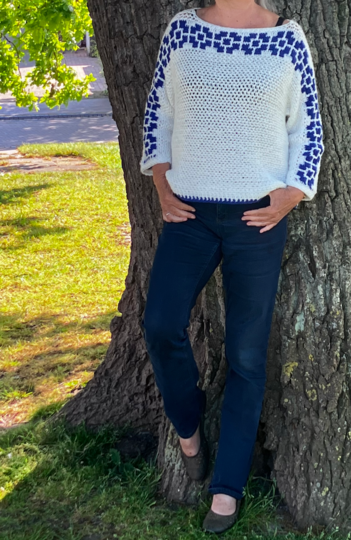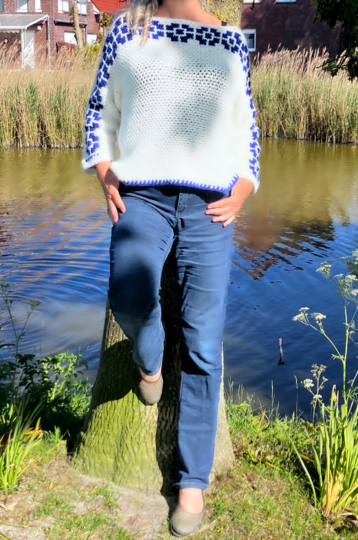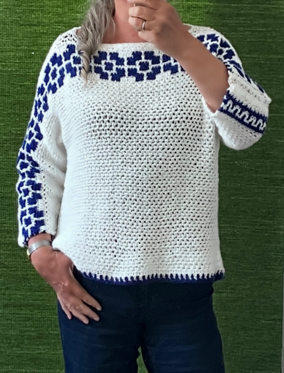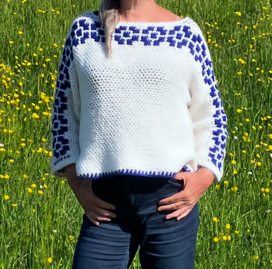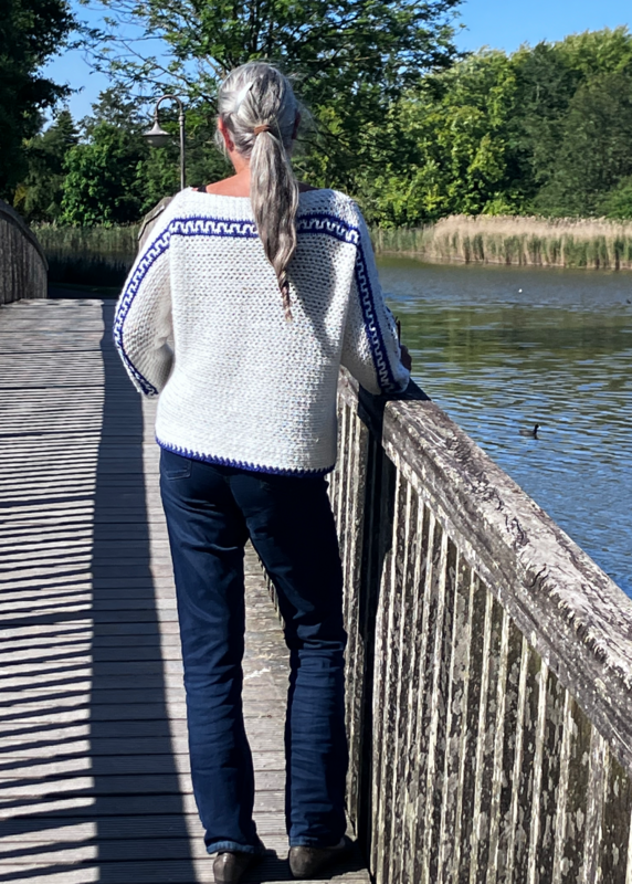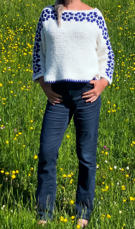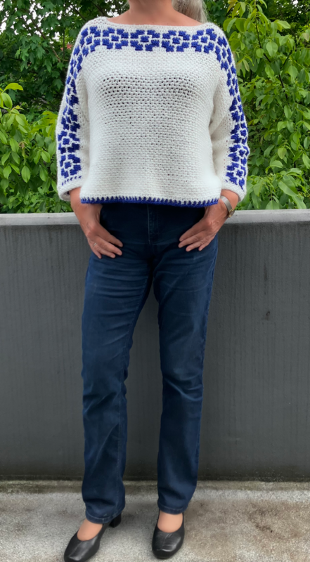Dieser Over-Size Pulli ist wirklich einfach zu häkeln. Er besteht aus 2 Teilen (Vorderteil/Rückenteil). Die Ärmel sind integriert. Das blaue Muster auf weißem Grund entsteht durch die Overlay-Technik, die sehr ausführlich erklärt wird und auch als Text für jede einzelne Reihe angegeben ist. Auch wenn es anders aussieht, du hast in einer Reihe immer nur eine Farbe am Start, also häkelst du eine weiße Reihe, danach eine blaue Reihe und wieder eine weiße Reihe, und so fort. Wie gesagt: das erkläre ich ausführlich, es ist wirklich einfach. Du kannst den Pulli lang oder kurz machen, breit oder schmal, mit langem Arm oder z.B. dreiviertel. Er ist in allen Größen machbar. Der Pulli ist wieder einer meiner „Bauchwegschummler“, von denen ich ja schon viele vorgestellt habe.