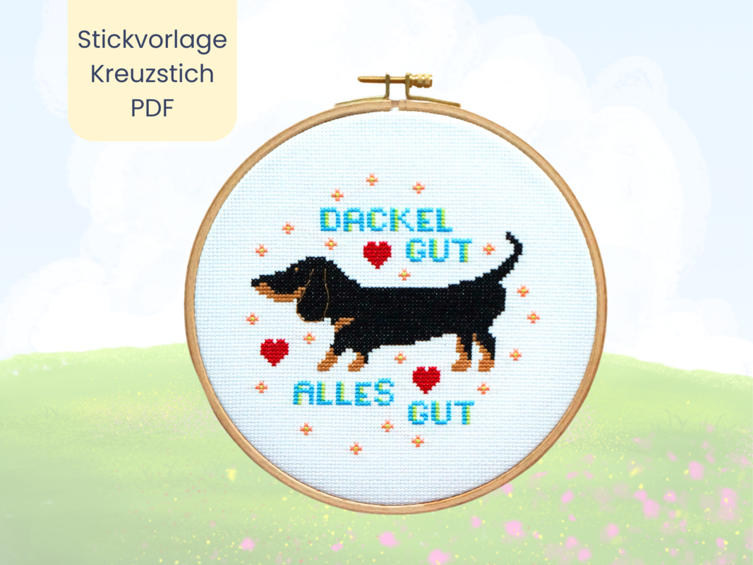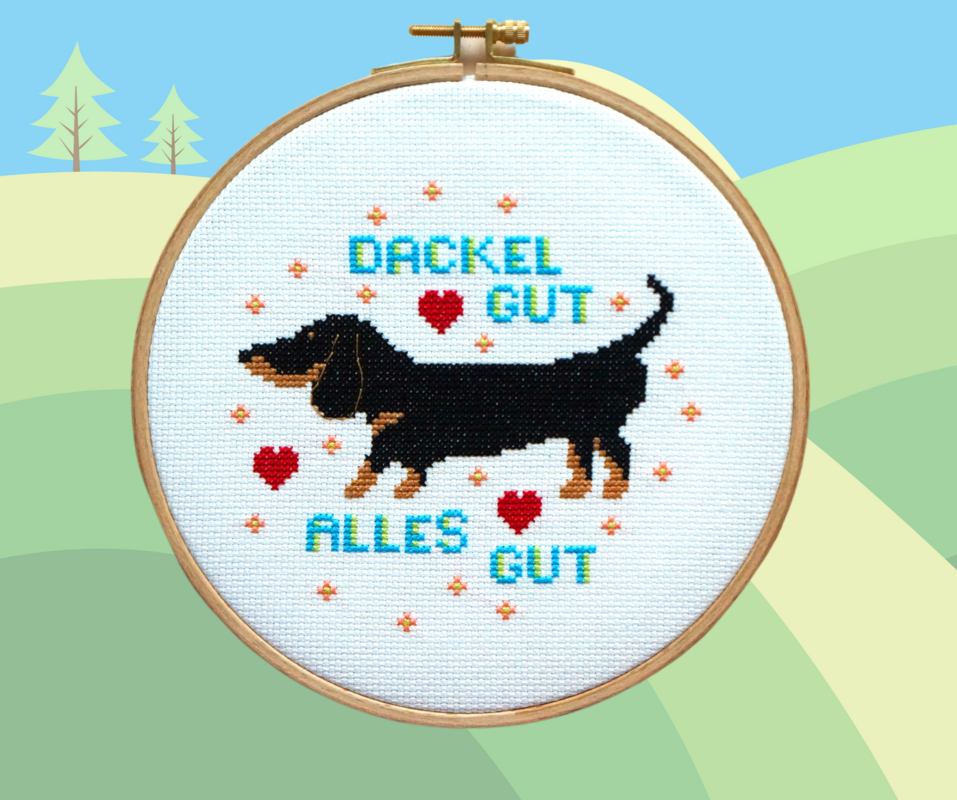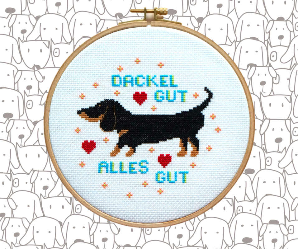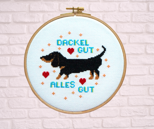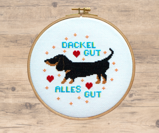 Ich habe den Dackel auf weissen Aida von Zweigart ( 5,4 Stiche pro cm bzw 14ct ) gestickt.