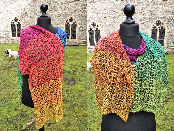 Man kann die Rechteckform in verschiedenen Größen stricken, als Stola oder Schal. Dafür gibt es detaillierte Hinweise, die es leicht machen, die gewünschte Größe zu stricken und die richtige Garnmenge zu kaufen.