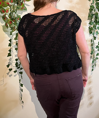 das Shirt wird in 2 Teilen gehäkelt. Dem Vorder- und dem Rückteil und dann zusammen gehäkelt oder -genäht.