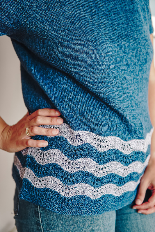 Der Rumpf wird von einem Lace-Muster in Wellenoptik geschmückt, die Ärmel werden ohne Abnahmen gerade gestrickt und nach wenigen Runden abgekettet.