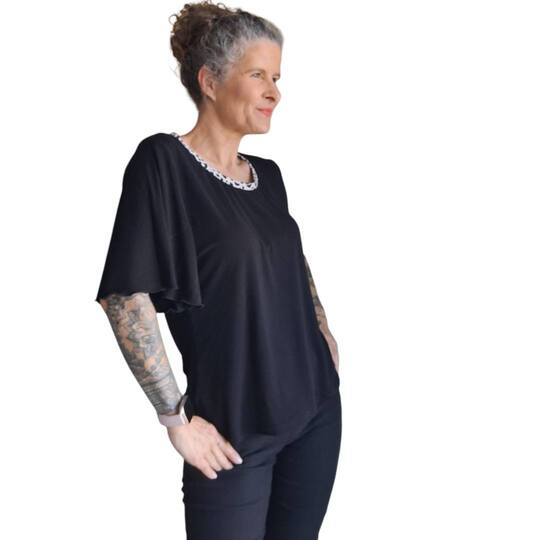 Du kannst zwischen einem eleganten Rundhalsausschnitt oder einem stilvollen V-Ausschnitt wählen. Die Ärmel haben einen besonderen Fall, der für einen tollen Look sorgt. Für die Ärmelsäume empfiehlt sich ein Rollsaum, um den Fall optimal zu betonen, aber auch klassisches Säumen ist natürlich möglich.