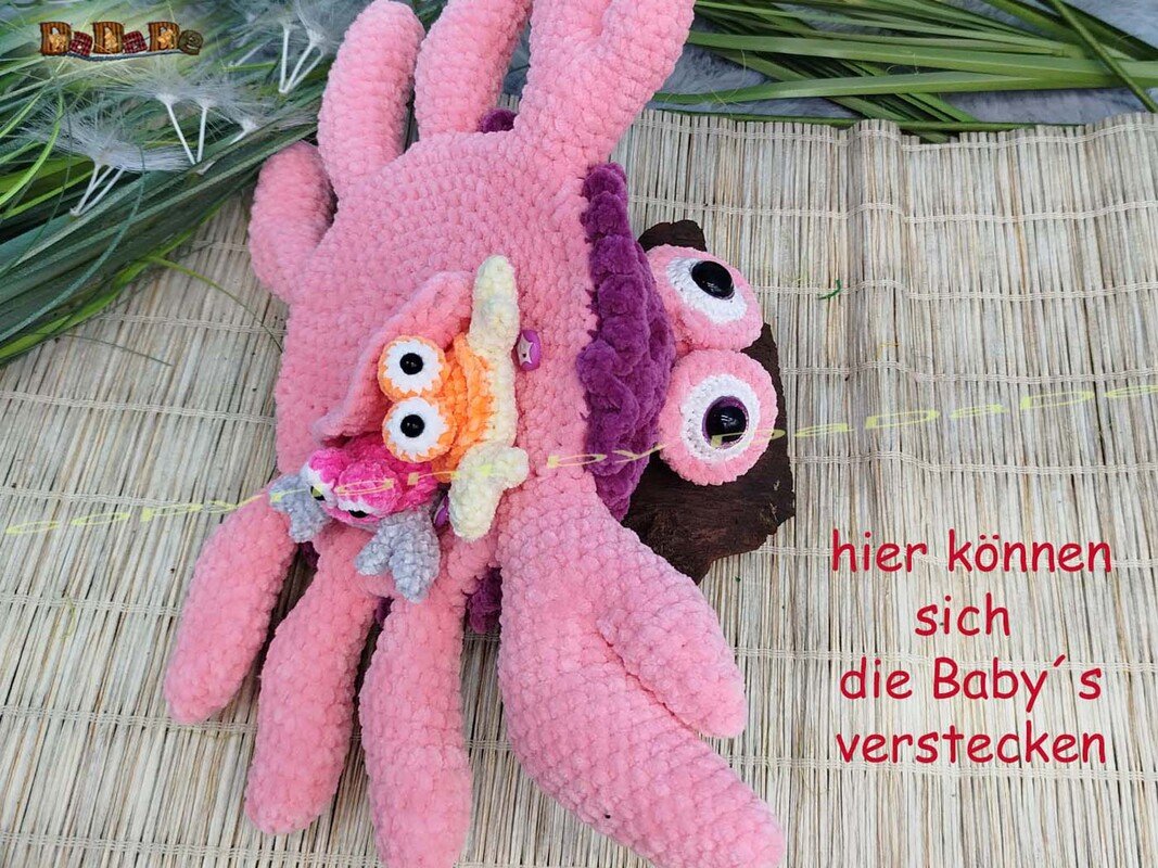 Mit Chenillewolle der Nadelstärke 3,5 wird die Krabbe ungefähr; 30cm breit und 13cm hoch