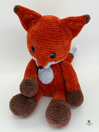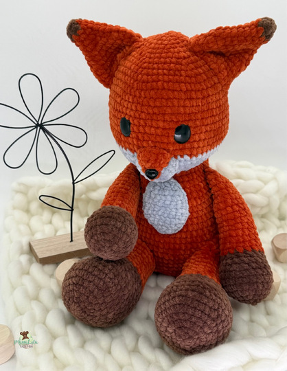 Mit den angegebenen Materialien wird der Fuchs aus der dünnen Chenille ca. 21 cm und aus der dicken Chenille ca. 30 cm groß.