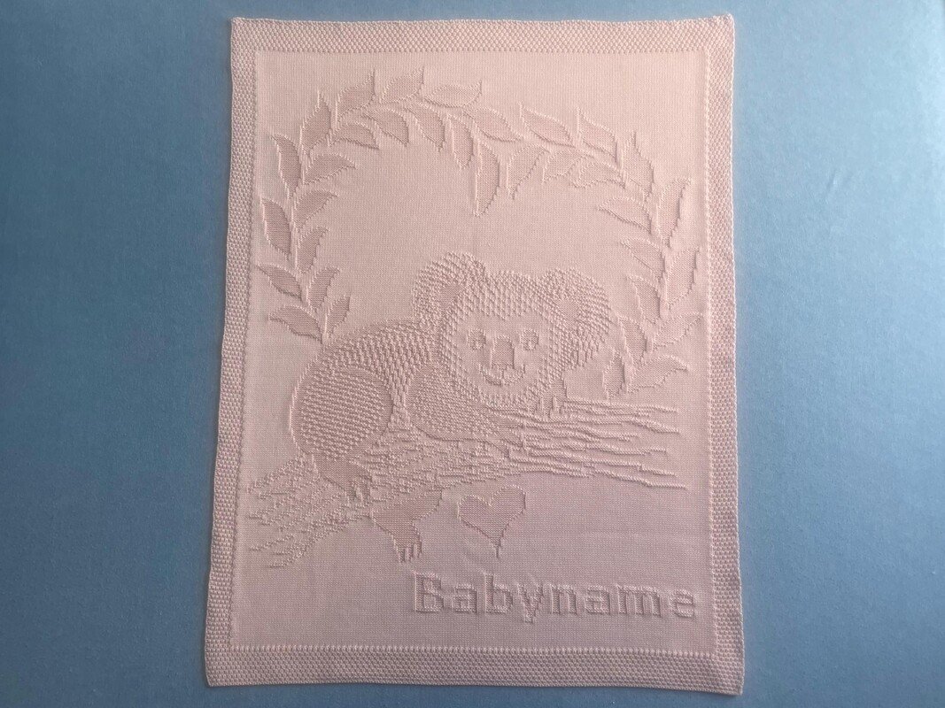 Die Decke wird nur mit rechten und linken Maschen gestrickt. Jede einzelne Masche ist geschrieben. Ein Zählmuster ist im Download ebenfalls enthalten.