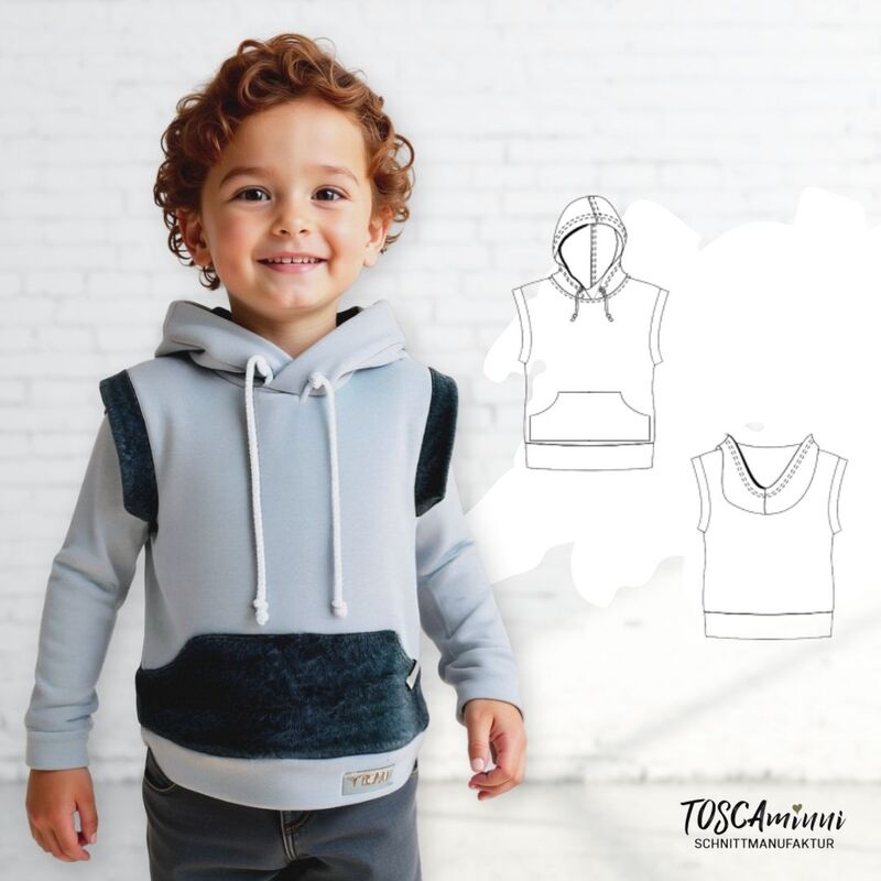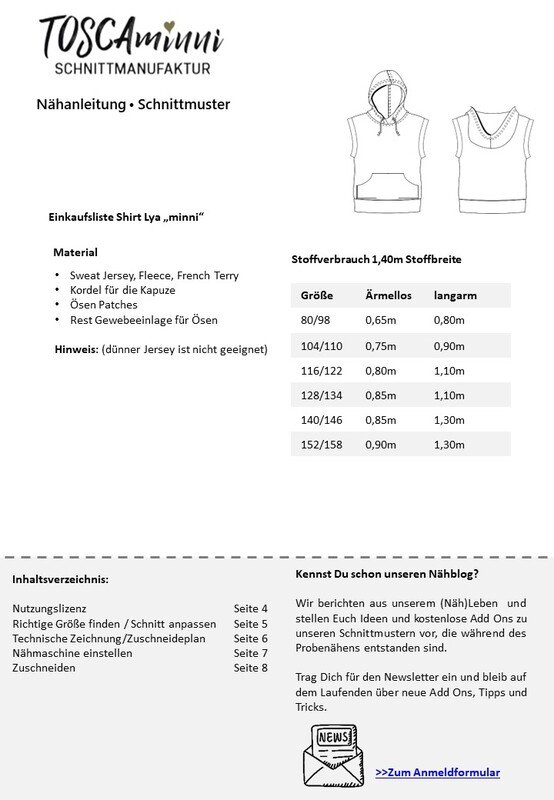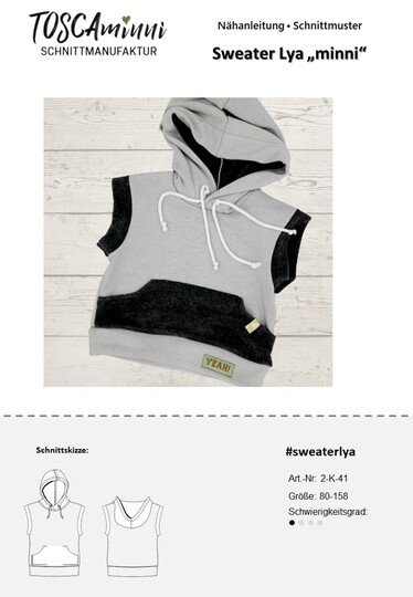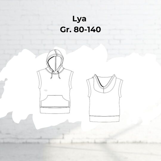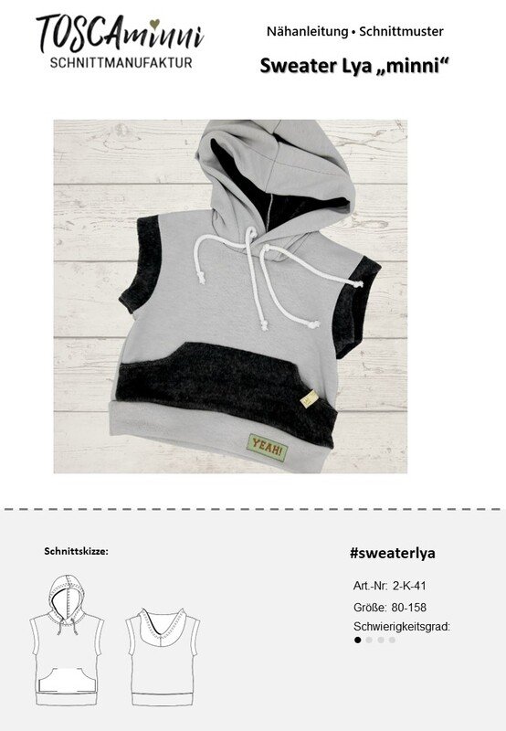 Mit dem Schnittmuster Lya "minni" nähst Du Dir einen coolen Pullunder mit Kapuze, der perfekt für die kühleren Tage als Kombination mit einem Longshirt geeignet ist. Die Kapuze und die Beuteltasche verleihen dem Sweater einen coolen Touch.