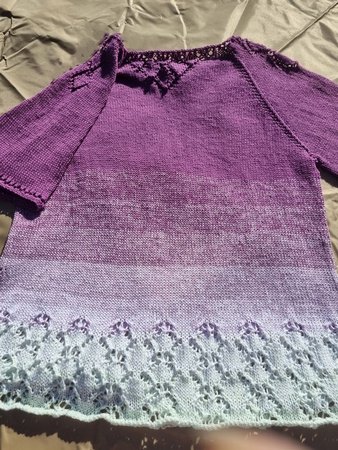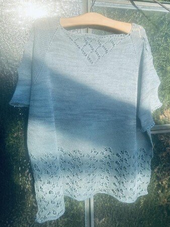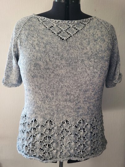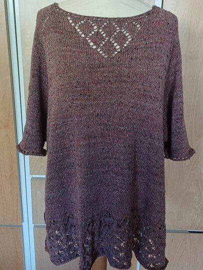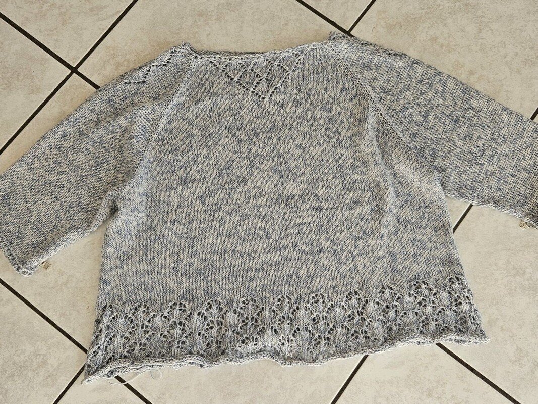 Die Highlights dieses Designs sind das Lochmuster am hinteren und vorderen Halsausschnitt und auf den Ärmeln. Im unteren Saum stricken wir ein weiteres Lochmuster, welches beliebig verlängert werden kann.