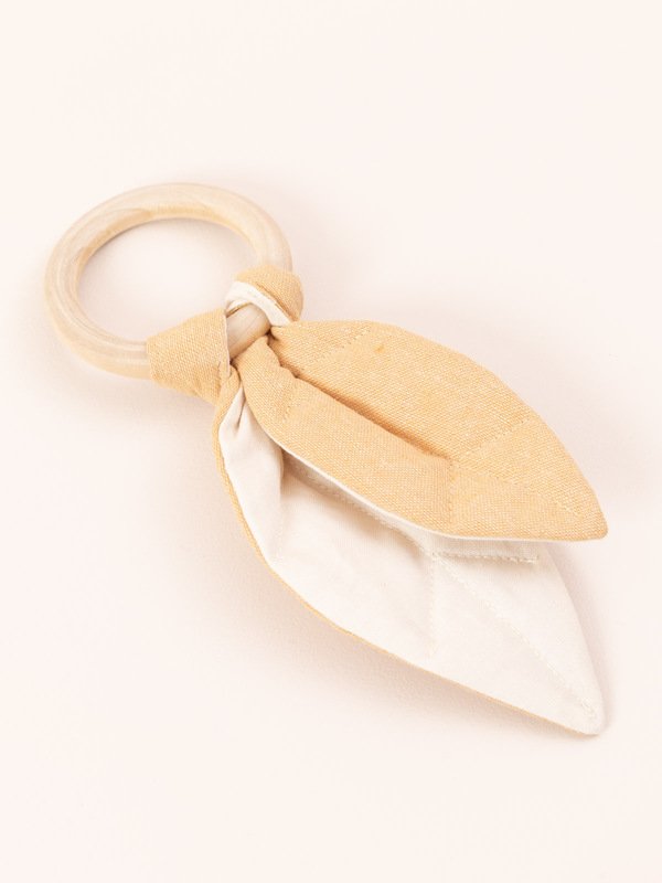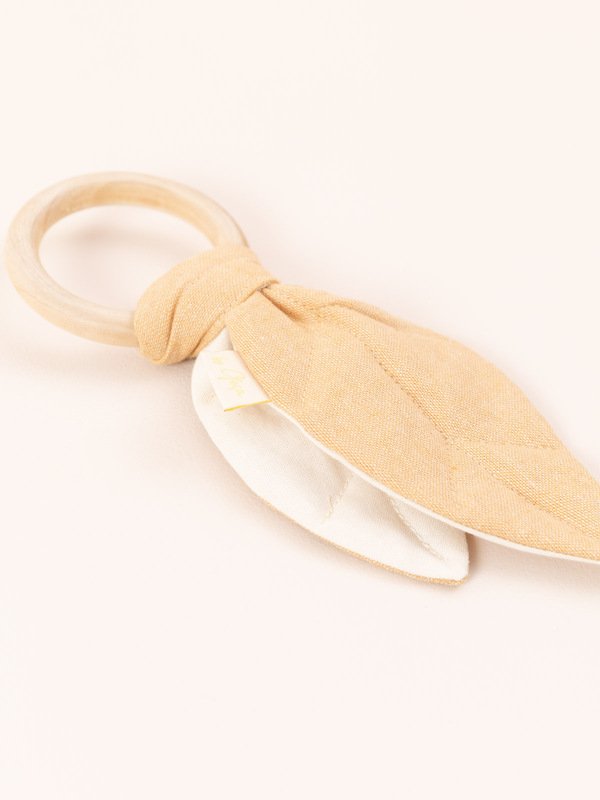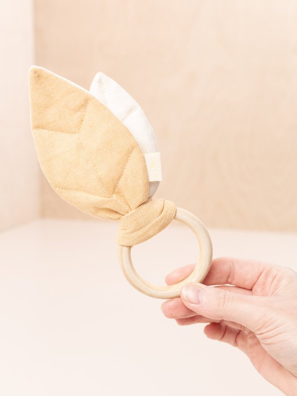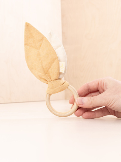 Die Beißringe waren eines meiner ersten Projekte, als ich anfing, Spielsachen für Babys zu nähen. Die Idee entstand, als meine Tochter noch klein war, und ich wollte etwas Praktisches und Schönes für sie schaffen. Der Beißring in Blattform wird um einen Holzring geknotet und ist nicht nur schlicht, sondern auch schnell genäht – perfekt als kleines Geschenk zur Geburt.