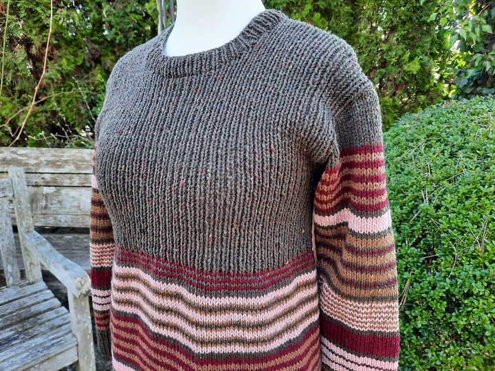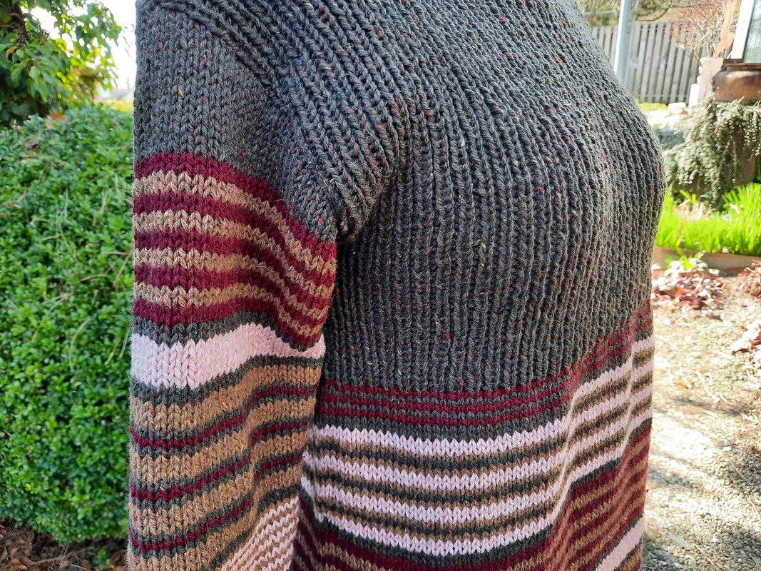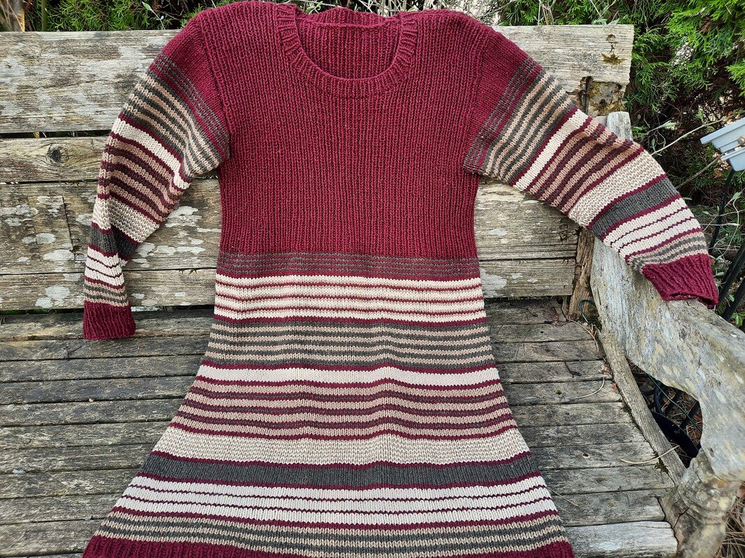 Das Design des Kleides ist einfach und für fortgeschrittene Anfänger geeignet. Lediglich für die Farbwechsel ist ein bisschen Erfahrung im mehrfarbigen Stricken hilfreich.