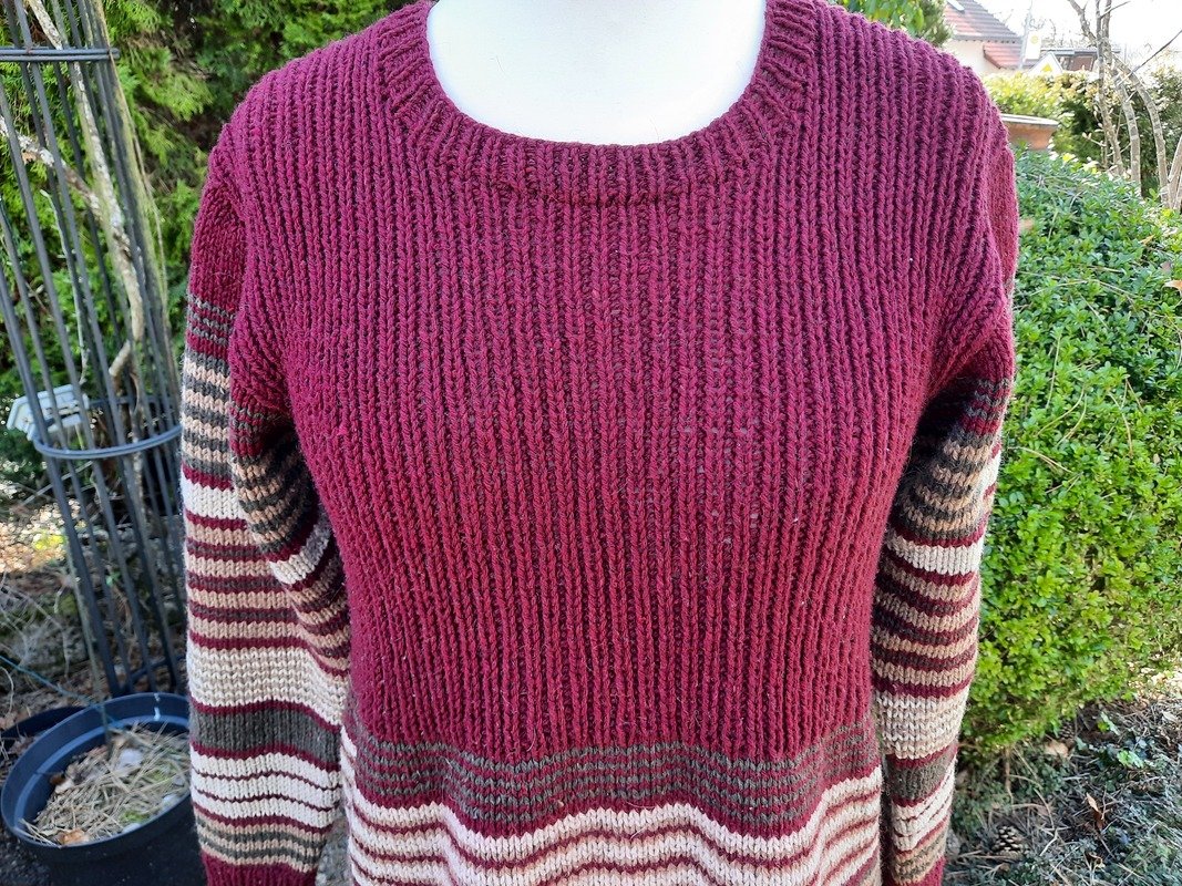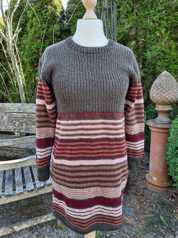Dieses Strickkleid trägt sich sehr unkompliziert mit Jeans oder Strumpfhose, ist sehr kuschelig und aus einem nachhaltigen Recycling-Garn gestrickt. Es ist leicht nachzuarbeiten, das Stricken ist wegen des Musters aber trotzdem nicht langweilig. Ich habe zwei verschiedene Farbvorschläge gestrickt: Ein Kleid in der Grundfarbe Olive Melange, das andere in Weinrot.