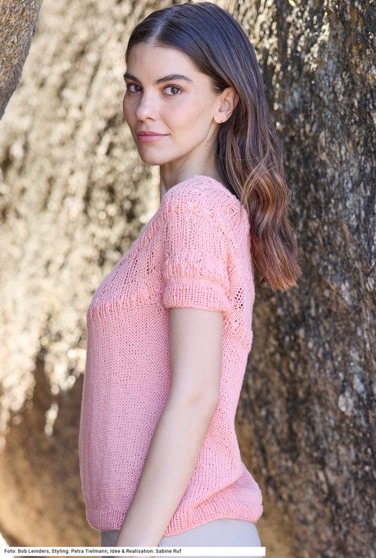 Bei diesem kurzärmeligen Pullover spielt es keine Rolle, welche Seite Sie als Vorderseite wählen. Das Modell mit gemusterter Rundpasse wird nämlich von oben nach unten in einem Stück gestrickt. Die Kettengarnkonstruktion des Baumwolle-Polyamid-Mischgarns sorgt zudem für fluffiges Volumen. Die Ausschnittblende wie auch die Bündchen an den Ärmeln und am Saum sind im 1/1-Rippenmuster gearbeitet. Danach folgen abwechselnd ein Schleifen- und ein einfaches Fallmaschenmuster und schließlich glatt rechts. Die Anleitung hierzu kann für die Größen 36/38, 40/42 und 44/46 downgeloadet werden.