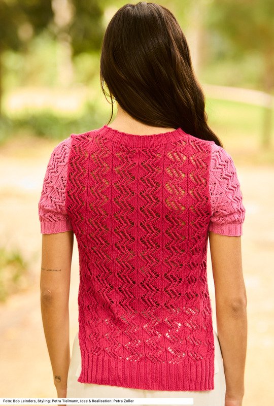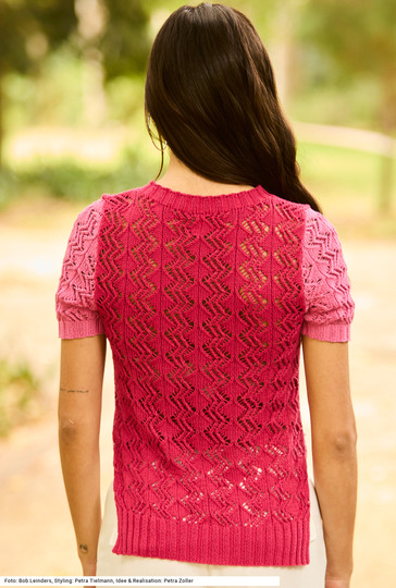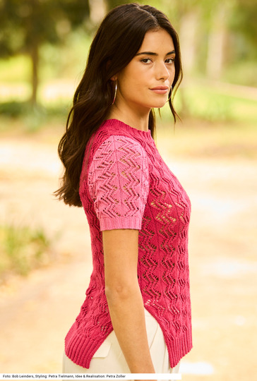 Dieser Pulli mit Seitenschlitzen beweist, dass schon der simple Einsatz von zwei verschiedenen Farben aus einer Farbfamilie für einen besonderen Effekt sorgen kann. Durch das besonders weiche Garn aus halb Baumwolle, halb Soja ist das Modell sehr angenehm zu tragen. Allover wird ein Ajourmuster gestrickt, Saum- und Ärmelbündchen sowie auch die Blende um den runden Halsausschnitt werden im 2/2-Rippenmuster gearbeitet. Durch die Ärmel mit Armkugel ist die Schulterpartie perfekt geformt. Eine Anleitung steht für die Größen 34/36, 40/42 und 46/48 zur Verfügung.