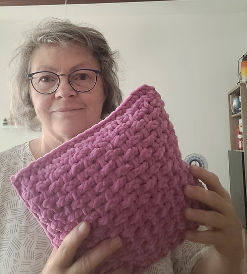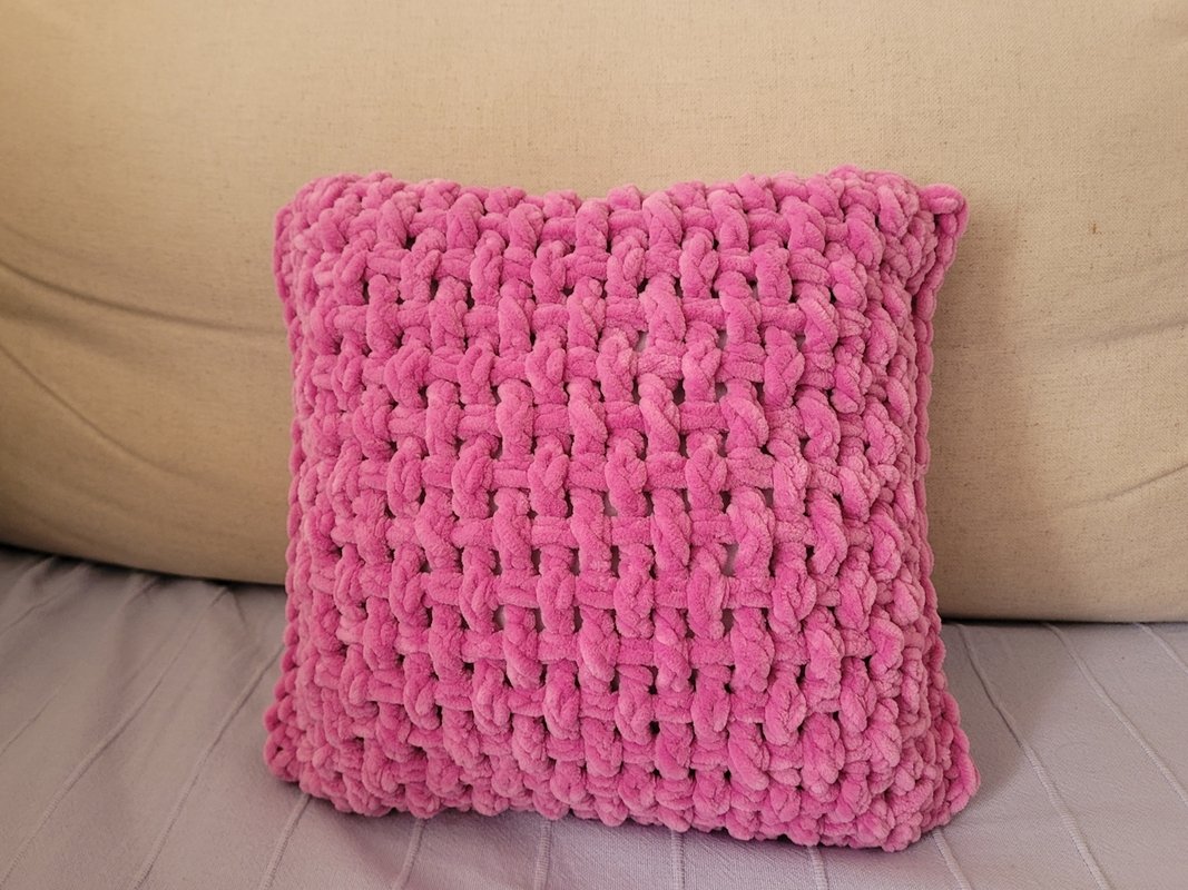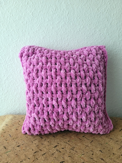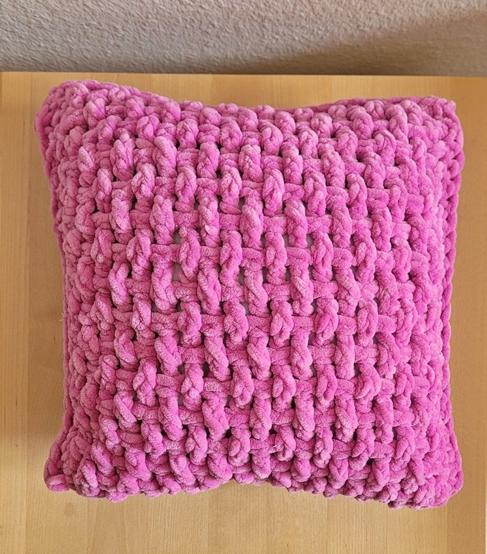 Das Kuschelkissen Emiliana ist ein kleines, sehr weiches Kissen, das besonders von kleinen Kindern gerne zum Einschlafen genommen wird. 20mal 20 cm groß, gehäkelt in einem interessanten Flechtmuster aus weichem Chenille Garn. Das kann natürlich auch in anderen Größen und Farben hergestellt werden. Sogar Decken können mit diesem Muster gehäkelt werden.