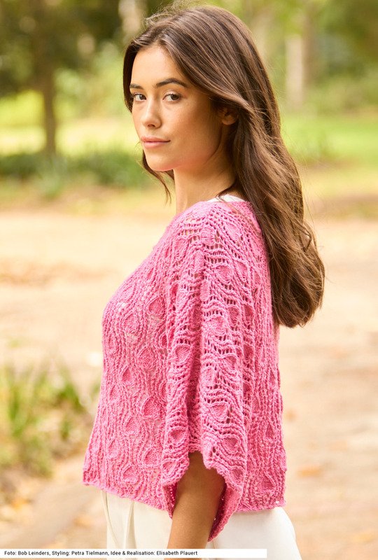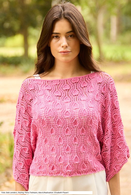 Der Schnitt dieses oversized geschnittenen Pullis mit besonders weiten, bis knapp über die Ellbogen reichenden Ärmeln ist ganz simpel. Für mehr Aufmerksamkeit sorgt das luftige Blattmuster – und das nicht nur während des Strickens. Durch den geraden Schnitt ergibt sich der U-Boot-Ausschnitt, der am Ende noch mit einer Runde fester Maschen umhäkelt wird. Hinzu kommt, dass das weiche Garn aus Baumwolle und Seide ganz besonders angenehm auf der Haut ist. Die Anleitung hierzu kann für die Größen 36/38, 42/44 und 48/50 downgeloadet werden.