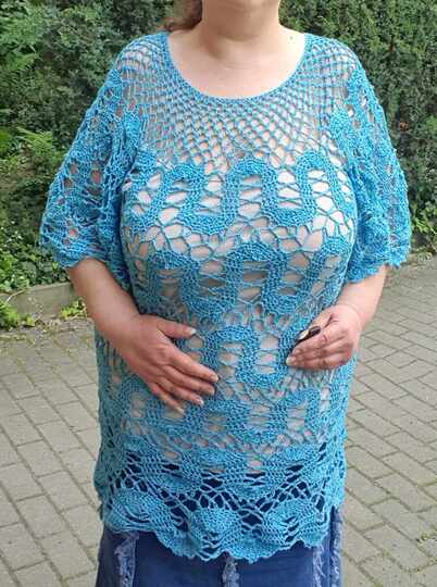 Die Tunika/das Kleid können mühelos an alle Längen und Größen angepasst werden, der untere Abschluß kann gerade oder schräg gearbeitet werden und es sind sowohl nur Träger, als auch Ärmel in jeder gewünschten Länge möglich.