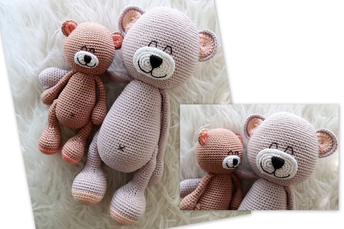 Wenn du mit Baumwolle (125m LL auf 50g) häkelst, wird dein großer Bär ca. 28cm hoch/lang.