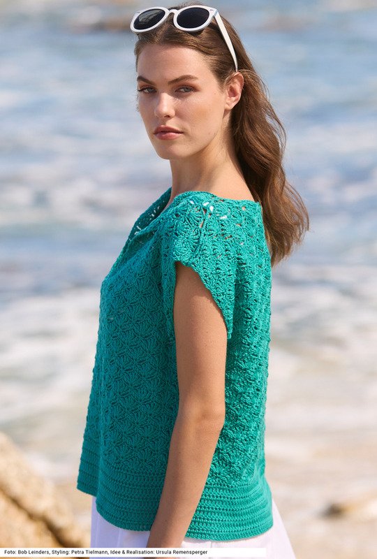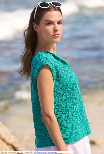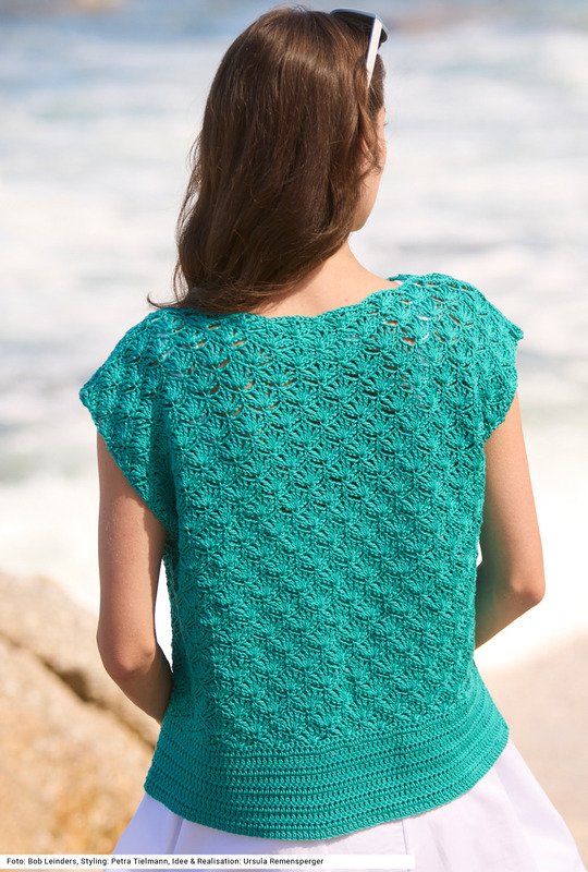 Hier kommen Häkelfans ganz auf ihre Kosten. Das ärmellose Shirt weckt mit seinem Muschelmuster die Sehnsucht nach dem Meer. Es ist nach Häkelschrift einfach zu arbeiten. Das Modell mit Schlitz am vorderen Ausschnitt ist ganz gerade gearbeitet, wodurch sich überfallende Schultern ergeben. Der breite Bund wird mit einem Stäbchenmuster betont. Für ein Sommermodell passend, ist das Ganze aus reinem Baumwollgarn gearbeitet. Eine Anleitung steht für die Größen 36/38, 40/42 und 44/46 zum Download bereit.