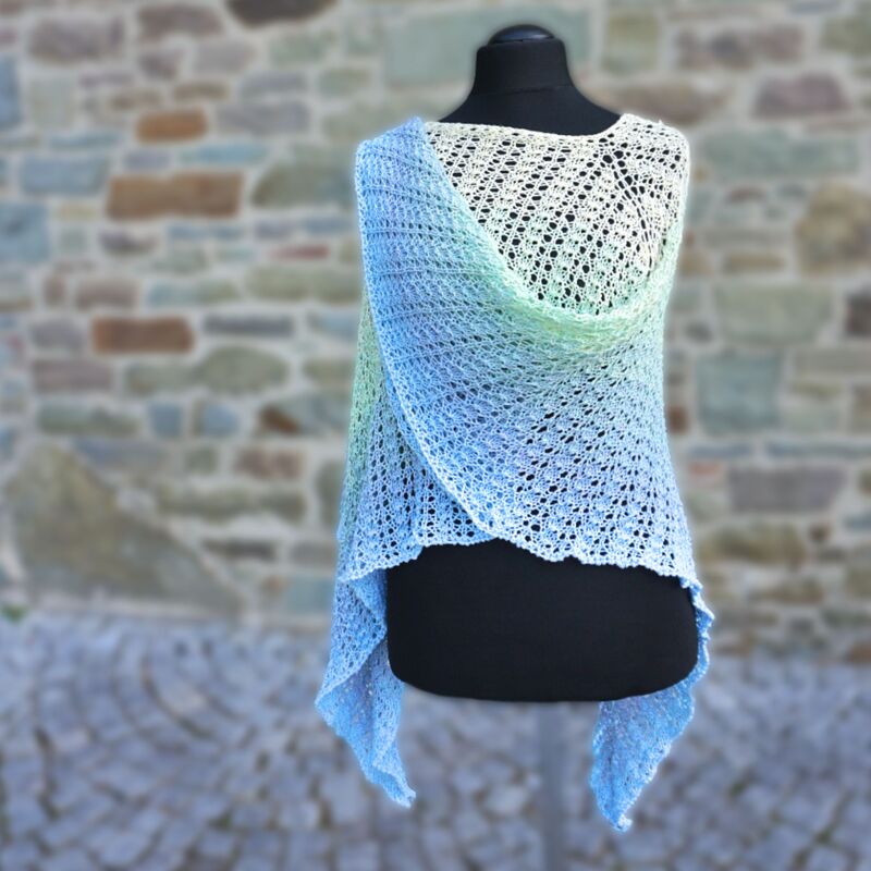 Tricandia ist ein luftiger Sommerponcho in Dreiecksform, den man auf vielfältige Weise tragen kann. Eine Spitze vorne oder hinten in der Mitte oder asymmetrisch.