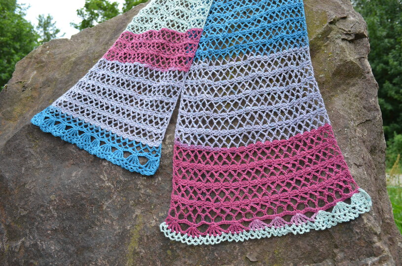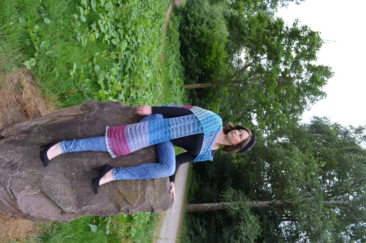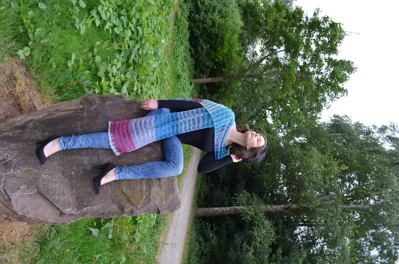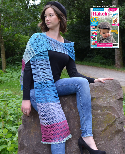 "Ein Fest für die Sinne! Ein „Hauch“ von Schal, der selbst das einfachste Outfit in etwas ganz Besonderes verwandelt. Feinstes Lacegarn aus Merino mit raffiniertem Farbverlauf ist optimal für leichte Schals und Tücher geeignet".
