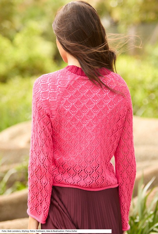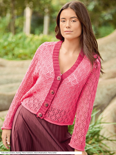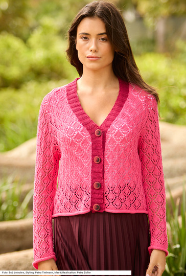 Ein klassischer Schnitt bei einer Jacke mit V-Ausschnitt muss nicht langweilig sein. Das beweist dieses Modell mit Rauten-Lochmuster. Das rührt daher, dass die Vorderteilblende farblich abgesetzt ist und die Ärmel ganz offen enden. Dadurch, dass das Muster zunächst mit glatt rechts beginnt, ergibt sich ein kleiner Rollrand an allen Teilen. Die Knopfblende wird im 2/2-Rippenmuster gearbeitet. Raglanärmel garantieren einen perfekten Sitz an den Schultern. Eine Anleitung für ein Garn aus reiner Baumwolle kann für die Größen 36/38, 42/44 und 48/50 downgeloadet werden.