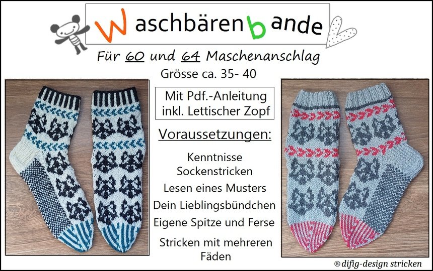 Das Sockenmuster Waschbärenbande gibt es in zwei Varianten. Einmal mit 60 Maschenanschlag und einmal mit 64 Maschenanschlag.