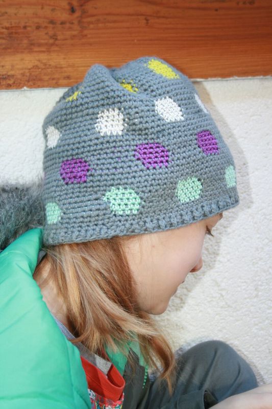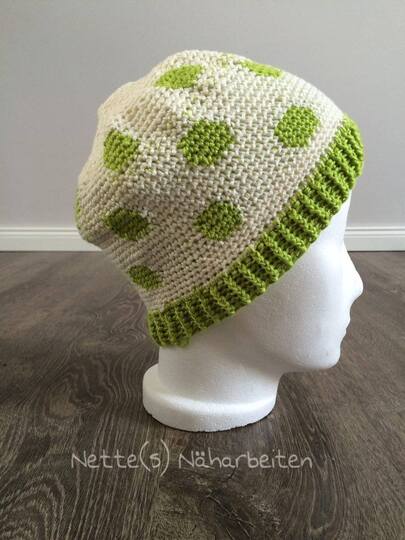 Es wird mit FM gehäkelt und Nadelstärke 2-3 oder höher (je nachdem, wie groß die Punkte werden sollen).