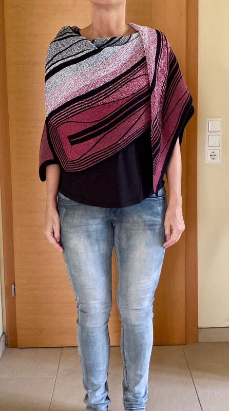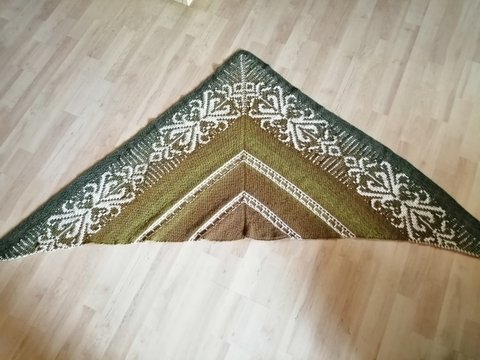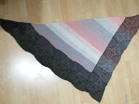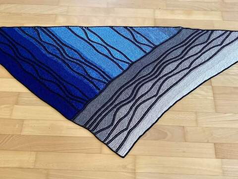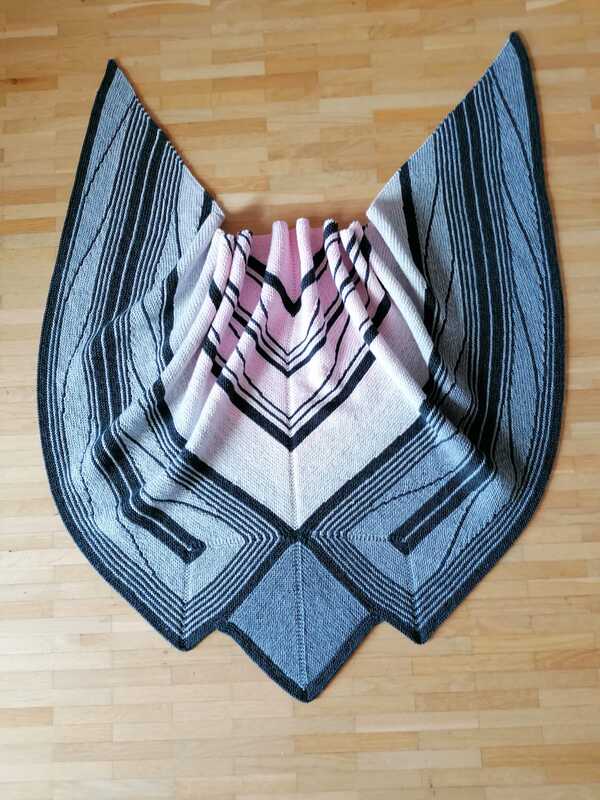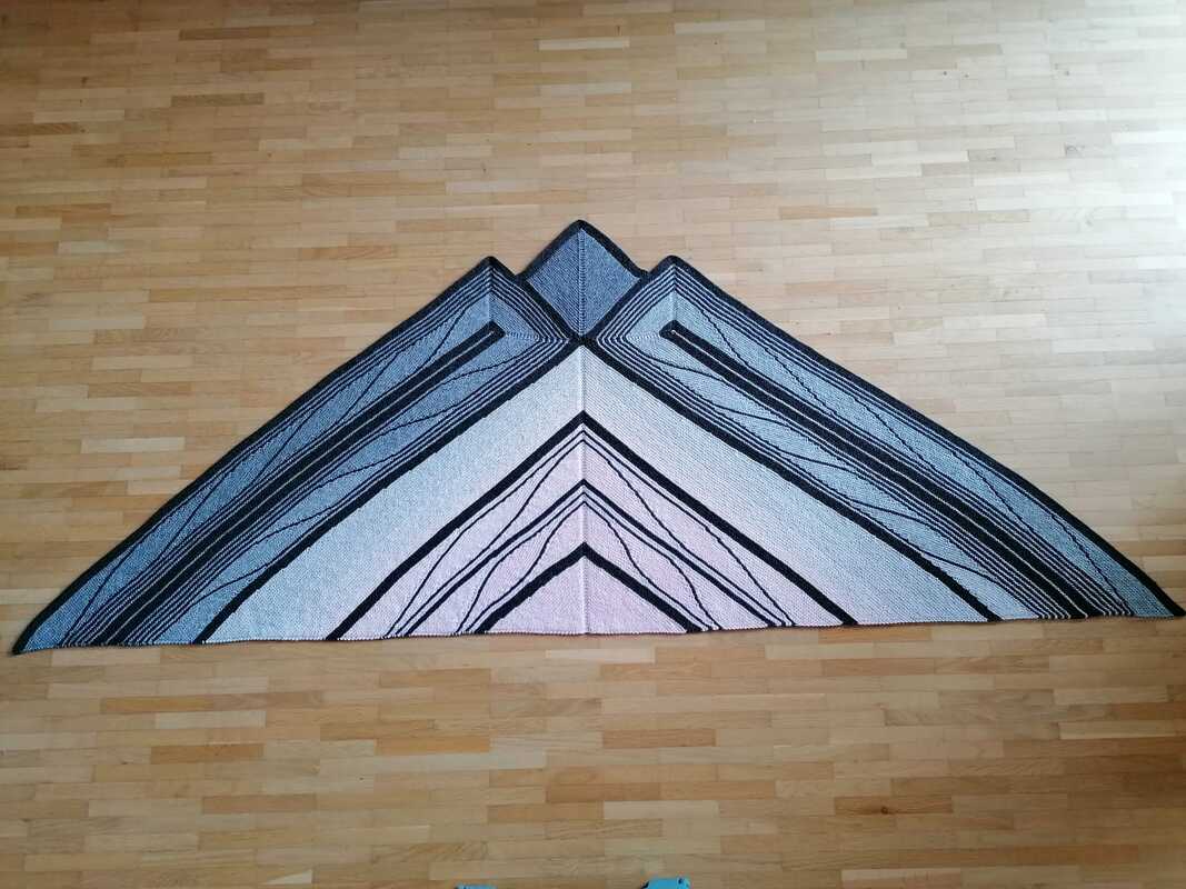 Es ist ein gleichschenkeliges Dreieckstuch und wird in verschiedenen Richtungen mit vielen verkürzten Reihen gestrickt.