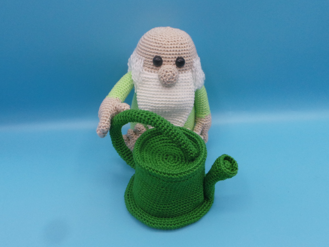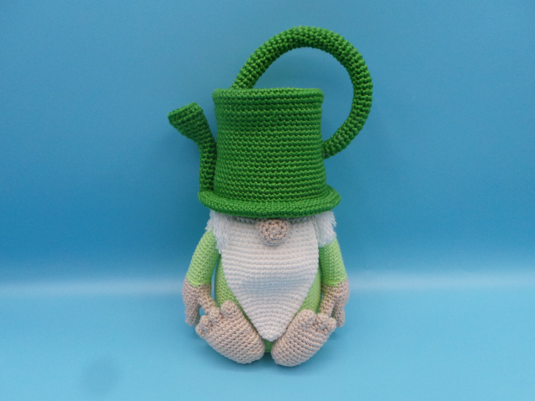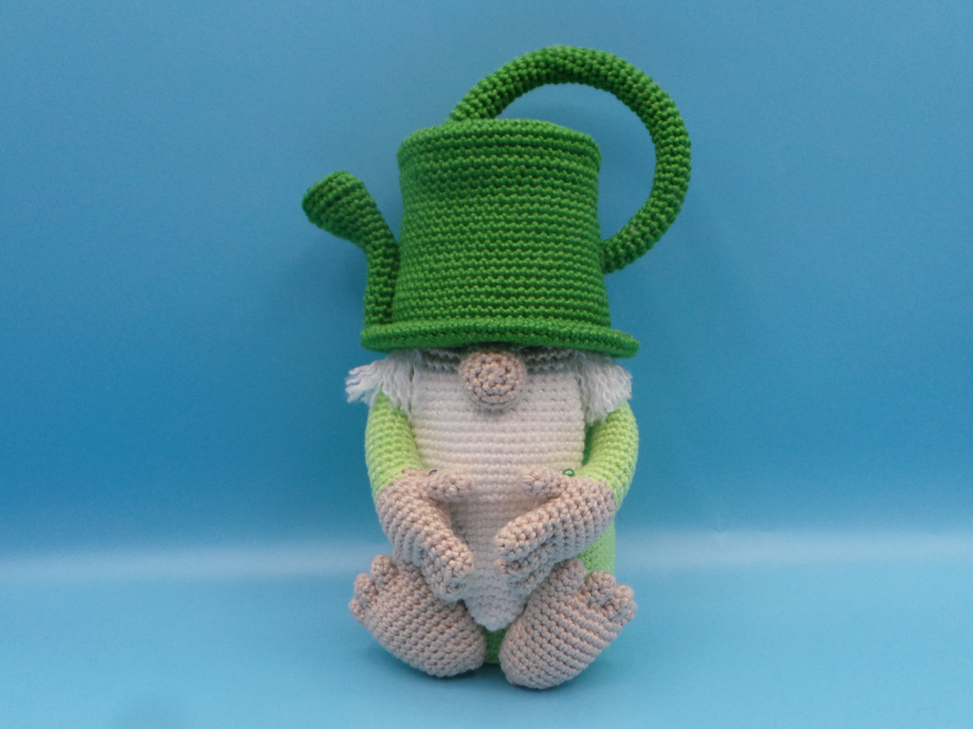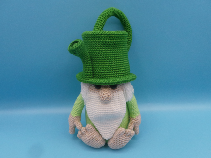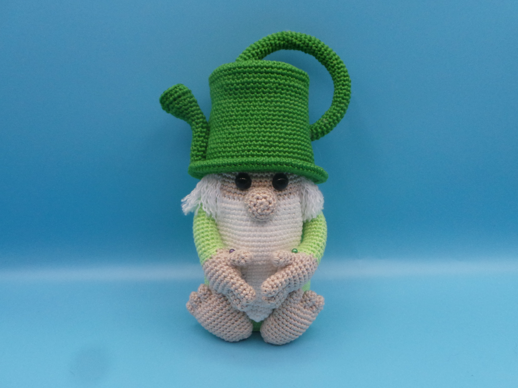 Der fertige Wichtel ist etwa 16 cm groß (ohne Gießkanne) und mit Gießkanne etwa 23 cm groß.