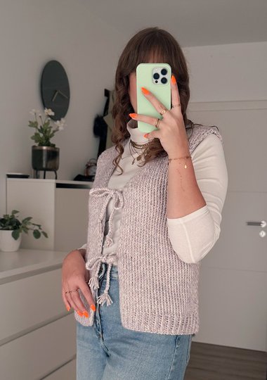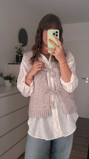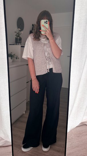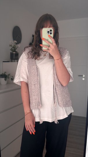 Durch die tiefen Armausschnitte lässt sie sich super über einem Oversize-Shirt, einem Longsleeve oder einer Bluse tragen – für einen lässigen, modernen Look mit besonderem Detail.