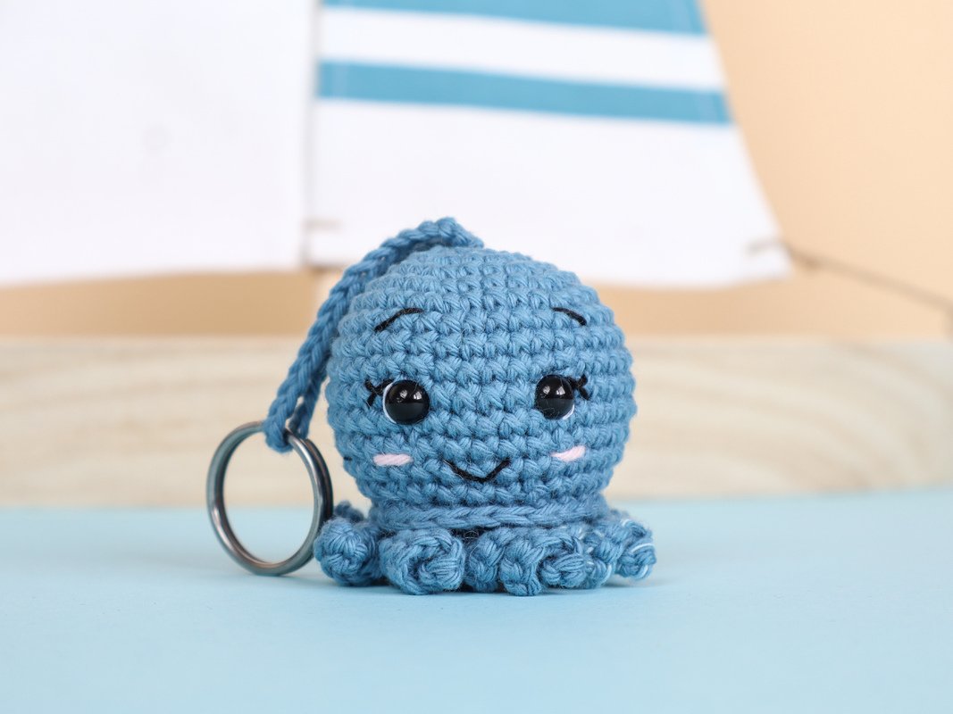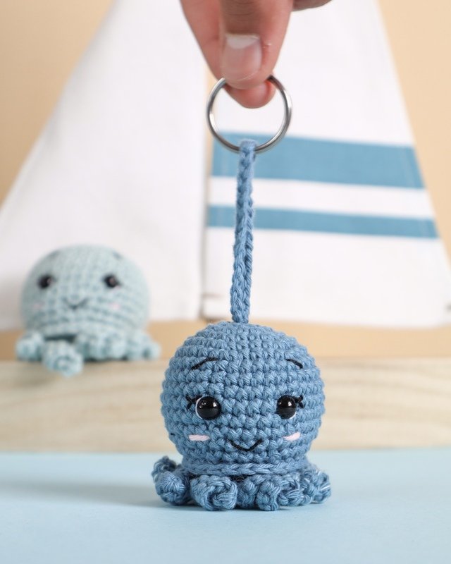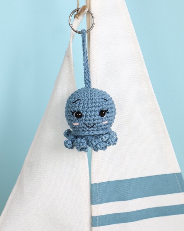 Dies ist eine digitale Häkelanleitung für den kleinen Oktopus Ove. Der kleine Oktopus kann als Schlüsselanhänger, Taschenbaumler oder auch als Geschenkanhänger verwendet werden.